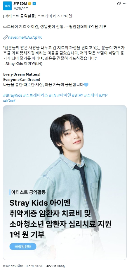 🔥 Stray Kids I.N บริจาคเงิน 100 ล้านวอนในวันเกิดให้แก่ศูนย์มะเร็งแห่งชาติ เพื่อสนับสนุนค่าใช้จ่ายการรักษาผู้ด้อยโอกาส