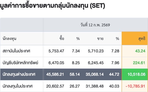 Sinthorn Summary 12/2/2569 : ต่างชาติซื้อสุทธิ 10,518.06 ลบ.