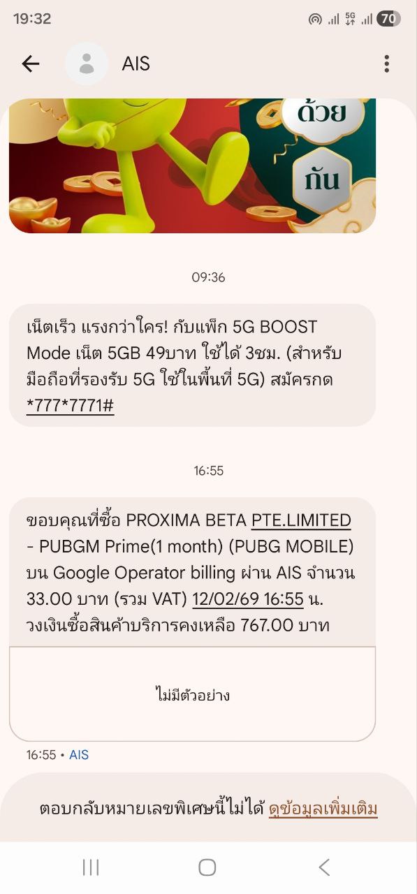 มีข้อความจากAISแจ้งถูกหักเงิน ซื้อสินค้าบริการroyalgame ผ่าน google operator billing โดยที่เราไม่ได้ดำเนินการ