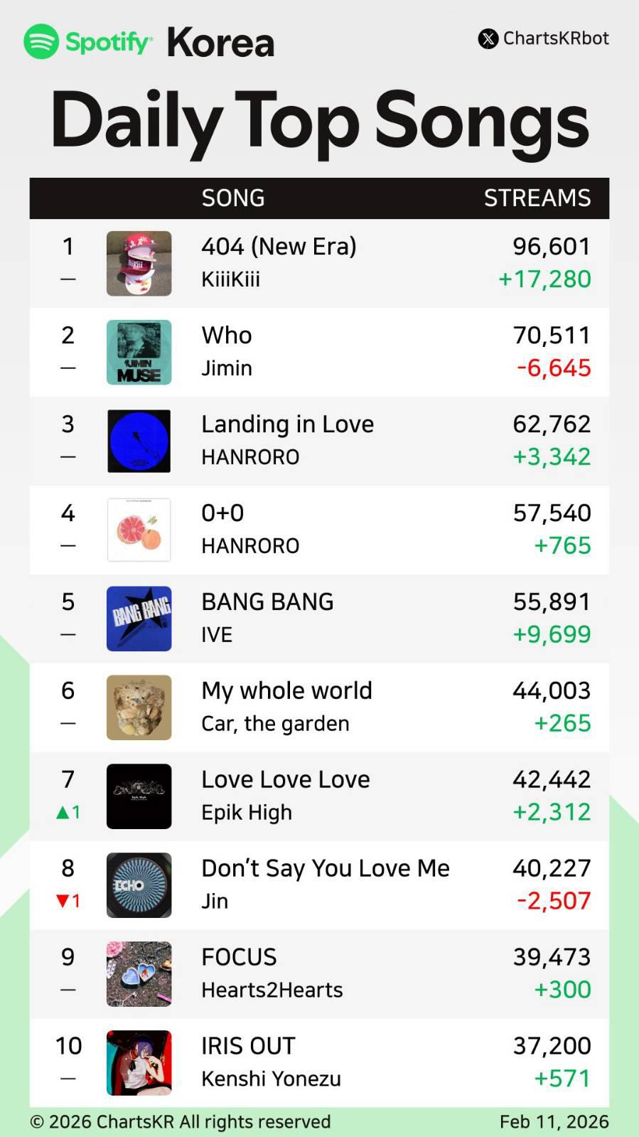 <📋>source: Spotify Charts.404 (New Era). ขึ้นสู่อันดับที่ #1 บนชาร์ต Spotify Dailyด้วยยอดสตรีมทั้งหมด 71,458 (+3,387) streams ประจำวันที่ 5 กุมภาพันธ์ 2026กลายเป็นซิงเกิ้ลแรกจาก KiiiKiii (คิ