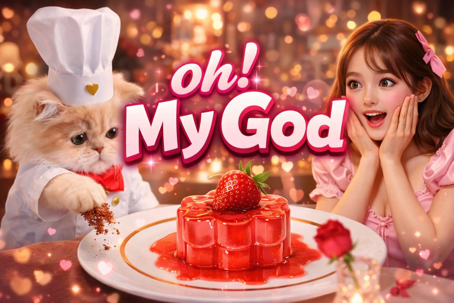 ในค่ำคืนวาเลนไทน์สุดหรู ร้านอาหารไฟอบอุ่นละมุนหัวใจมีเชฟตัวจิ๋วสุดน่ารัก—ลูกแมวเปอร์เซียขนฟูในชุดเชฟสีขาว หมวกสูงปักหัวใจทอง กำลังรังสรรค์เมนูพิเศษ “เจลลี่สตรอว์เบอร์รี่รูปดอกไม้” สีแดงฉ่ำวาววับ วางเด่นบนจานหรู ท่ามกลางแสงเทียนและบรรยากาศโรแมนติก