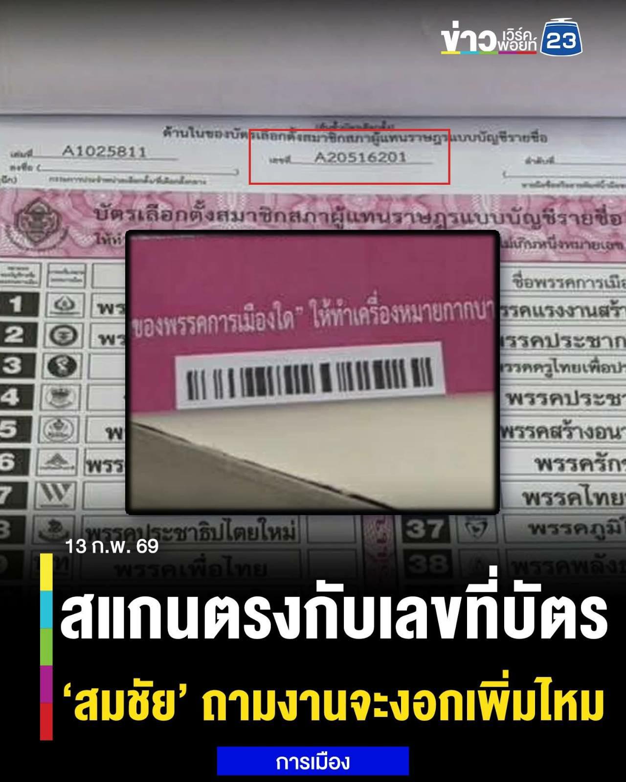 (13 ก.พ. 69) จากกรณีที่วานนี้(12 ก.พ.) มีผู้ใช้เฟซบุ๊กชื่อ Thanarat Kuawattanaphan ออกมาตั้งข้อสังเกตว่าที่ท้ายบัตรเลือกตั้งแบบบัญชีรายชื่อ หรือบัตรสีชมพู มีการพิมพ์บาร์โค้ดเอาไว้ เมื่อสแกนแล้วได้รหัส A ตามด้วยตัวเลขอีก 8 หลัก คล้ายกับเลขที่บัตรที่จะปรากฏบนต้นขั้วบัตรเลือกตั้ง จนมีความกังวลว่าจะทำให้สามารถสืบย้อนกลับไปได้ว่าบัตรใบนี้ ที่กาเลือกพรรคนี้ ใครเป็นคนกา เพราะที่ต้นขั้วบัตรนอกจากจะมีข้อมูลของบัตรแล้ว ยังมีข้อมูลของผู้ใช้สิทธิเลือกตั้งด้วย เพราะต้องลงลำดับตามบัญชีรายชื่อของหน่วย และต้องเซ็นลายเซ็นกำกับ ซึ่งนี่อาจทำให้การเลือกตั้งครั้งนี้ขัดกับข้อกฎหมายที่ระบุให้การออกเสียงเลือกตั้งต้องเป็นในทางลับ