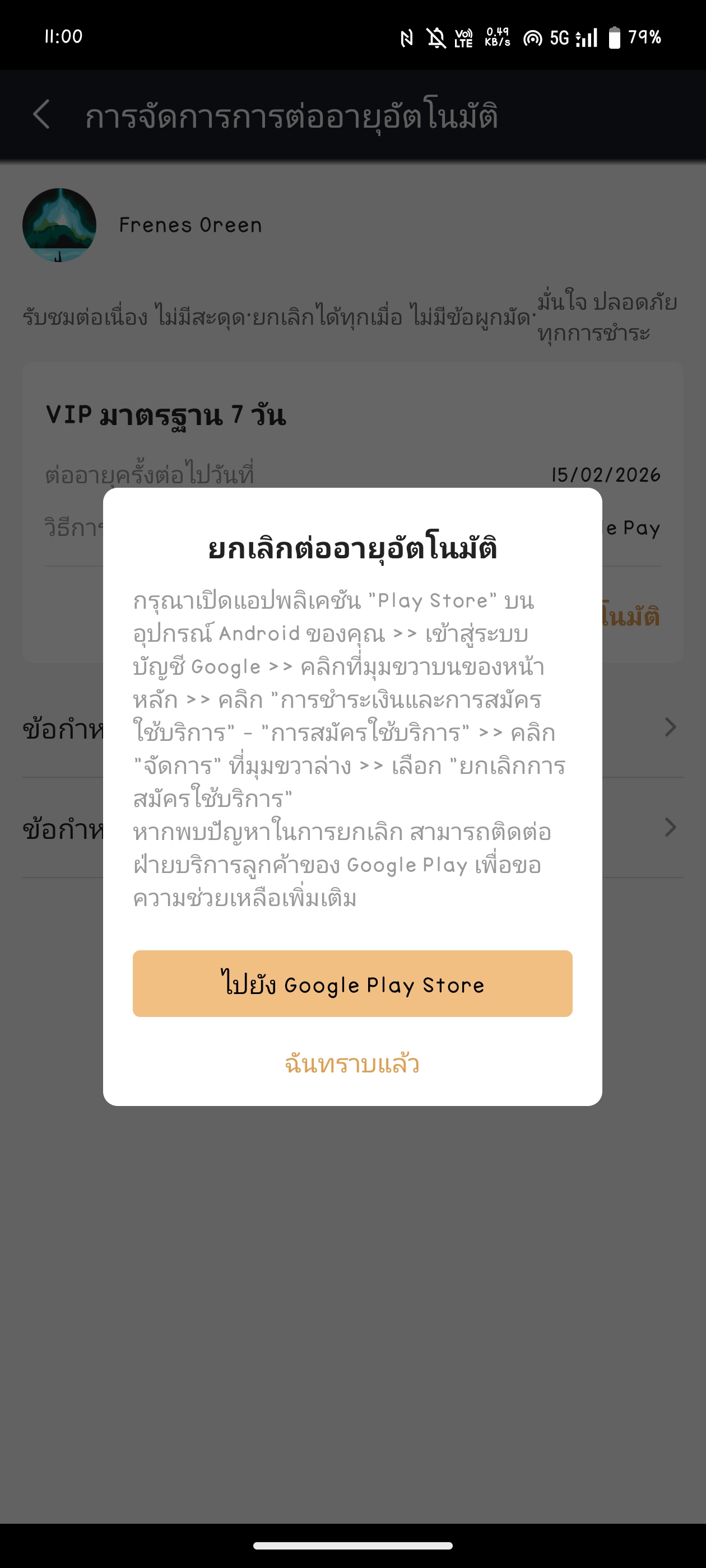 คือเราล็อคอินกับกูเกิลชำระผ่านวอเล็ทซึ่งมันหักเงินเราอัตโนมัติ จะกดยกเลิกในแอพก็ให้ไปที่ play store อีก พอเข้าไปก็ขึ้นไม่มีให้ยกเลิกอะไรเลย ครั้งแรกเราสมัครแบบ15บาทค่ะคิดว่าน่าจะต่ออัตโนมัติ1เดือน&