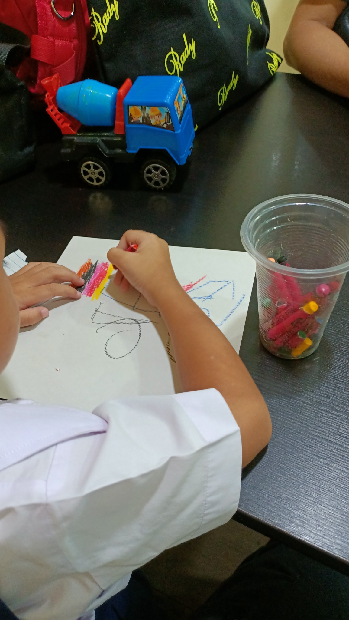 เจ้าของร้านเอากระดาษและสีเทียนมาให้ลูกชาย ผมระบายเล่นด้วยครับ