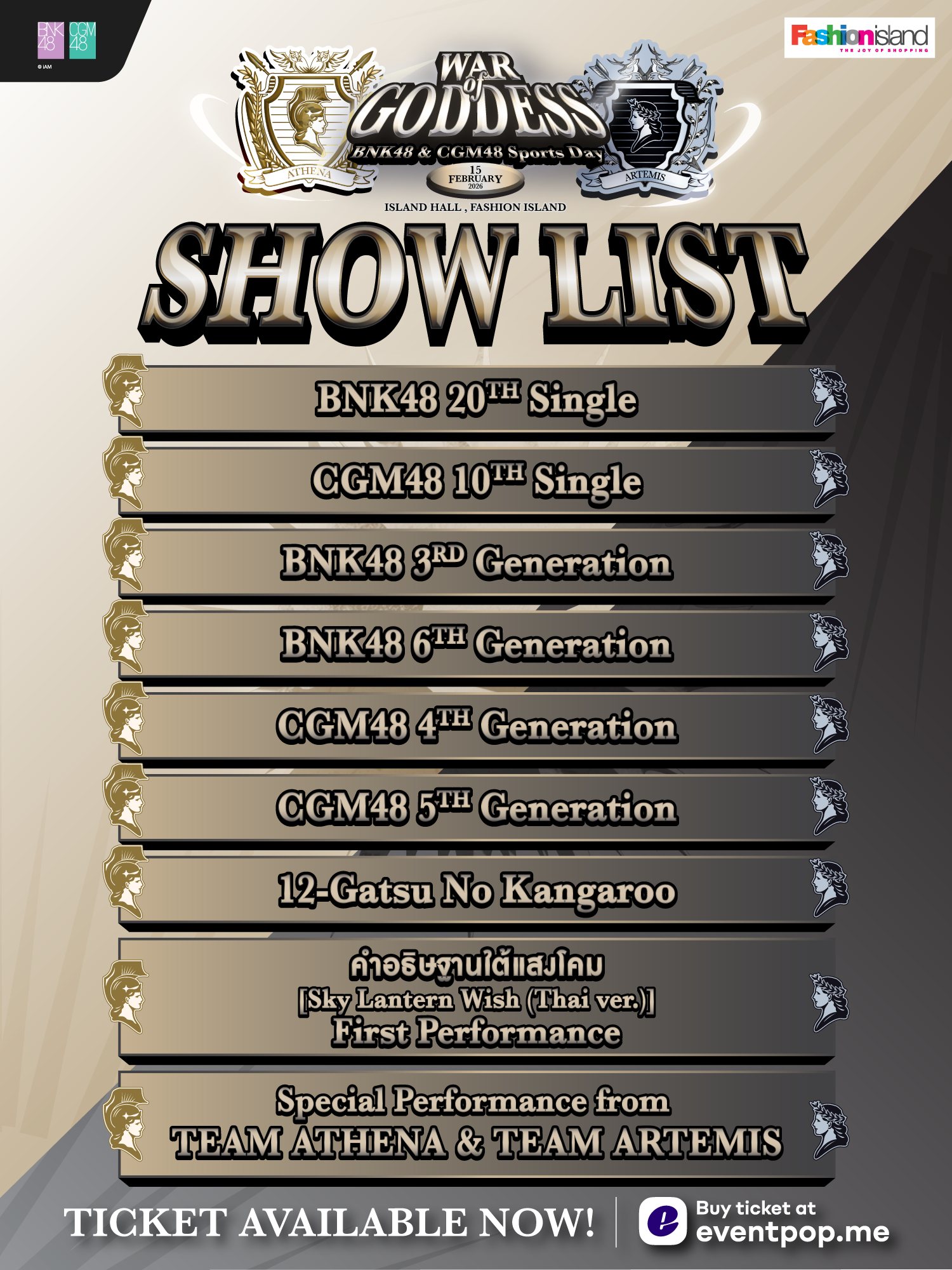 GAMES & RULES BNK48 & CGM48 Sports Day 2026 🗓️ 15 FEB 2026📍 ISLAND HALL 3FL., FASHION ISLAND TICKET AVAILABLE NOW!🔗 https://www.eventpop.me/e/128936/war-of-goddess