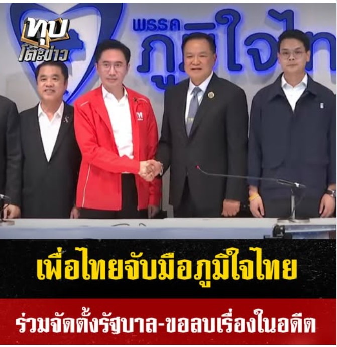 จับมือไว้แล้วไปด้วยกัน "ยศชนัน" สวมแจ็คเก็ตแดง นำทีมเพื่อไทย ร่วมแถลงข่าวกับ "อนุทิน" ยืนยันจับมือร่วมตั้งรัฐบาล