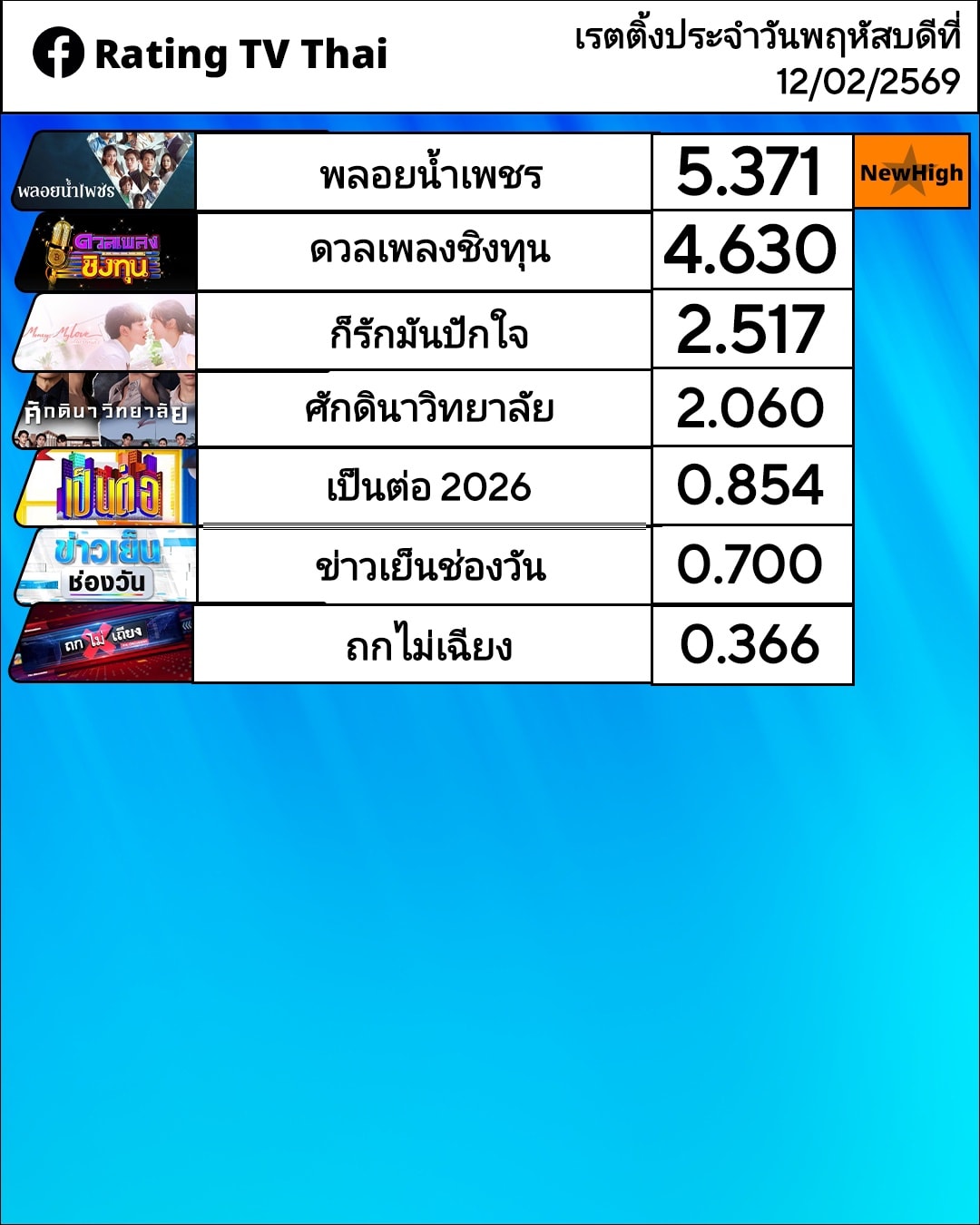 📌 เรตติ้งละคร “ก็รักมันปักใจ” EP.4-2.5 / “ศักดินาวิทยาลัย” EP.8 / “พลอยน้ำเพชร” EP.4 New High!!! cr. Rating TV THAI 🎉