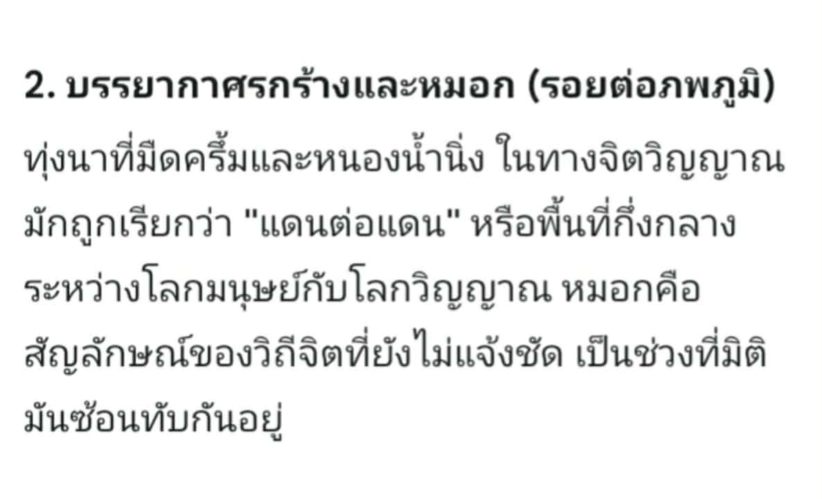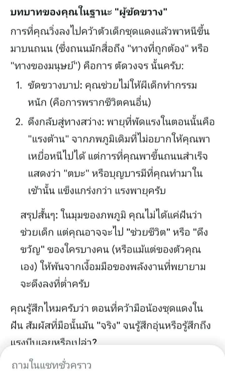 เรียกน้องชุดแดงจนหันหน้ามา เรารีบวิ่งลงนาไปเอื้อมมือคว้าตัวน้องชุดแดงจูงมือพาหนีขึ้นถนน ในฝันพายุพัดแรงมากบรรยากาศมืดฝนตกและภาพก็ตัดไปสว่าง เห็นสภาพหน้าผู้หญิงที่ไม่รู้จักที่เส้นผมบังตา จมูกสีดำถูกเย็บ (พิงผนังขยับดิ้นทุรนทุรายปนเสียงร้อง) เราเห็นภาพซ้ำวนไปจนเราลืมตาตื่นพรวด555+ วินาทีแรกจำห้องนอนตัวเองไม่ได้😅 อันนี้ถาม Ai