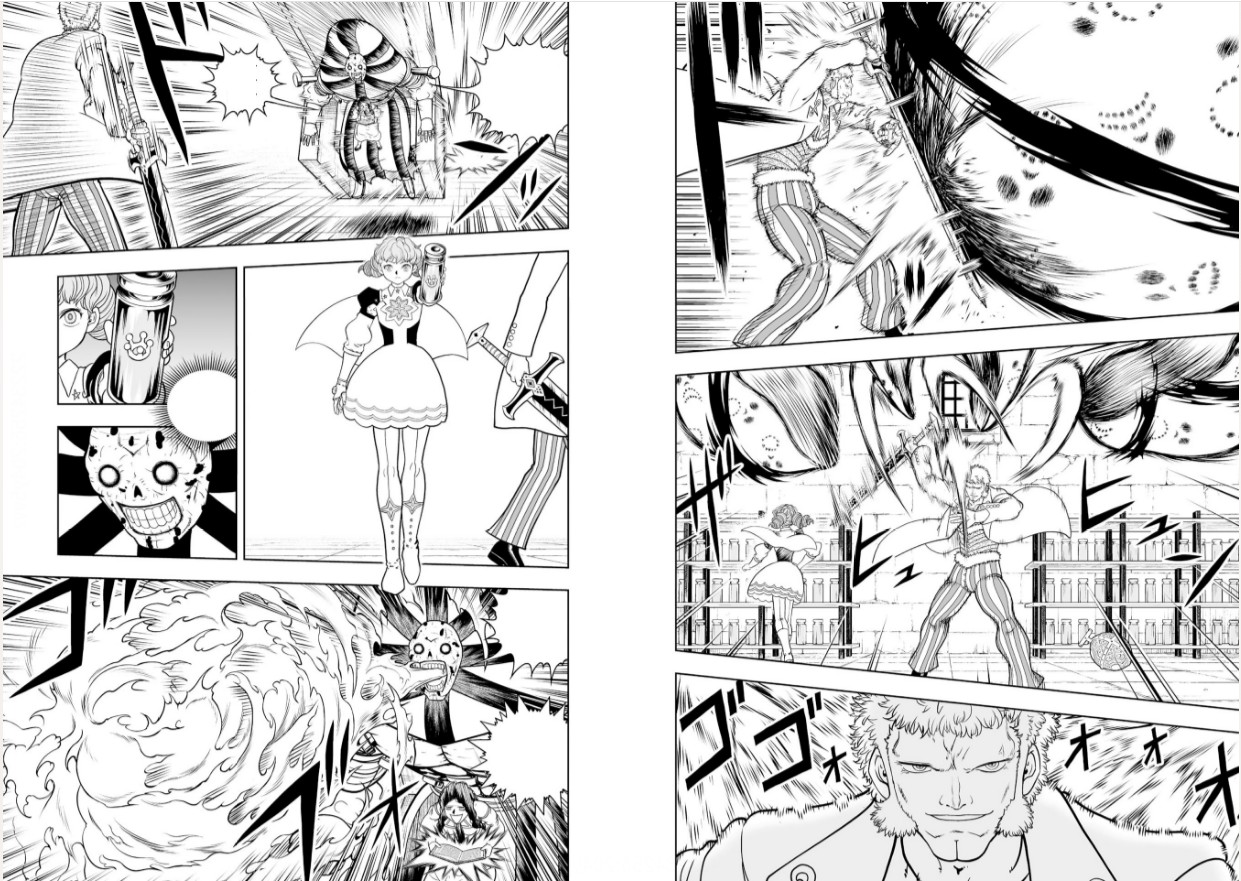 ทางฝั่งพวกคิโยมาโระ (ประกอบด้วย คิโยมาโระ, กั๊ช, คุณเมกูมิ, ทีโอ, ดาเรีย, เบลกิม ค.ก.)