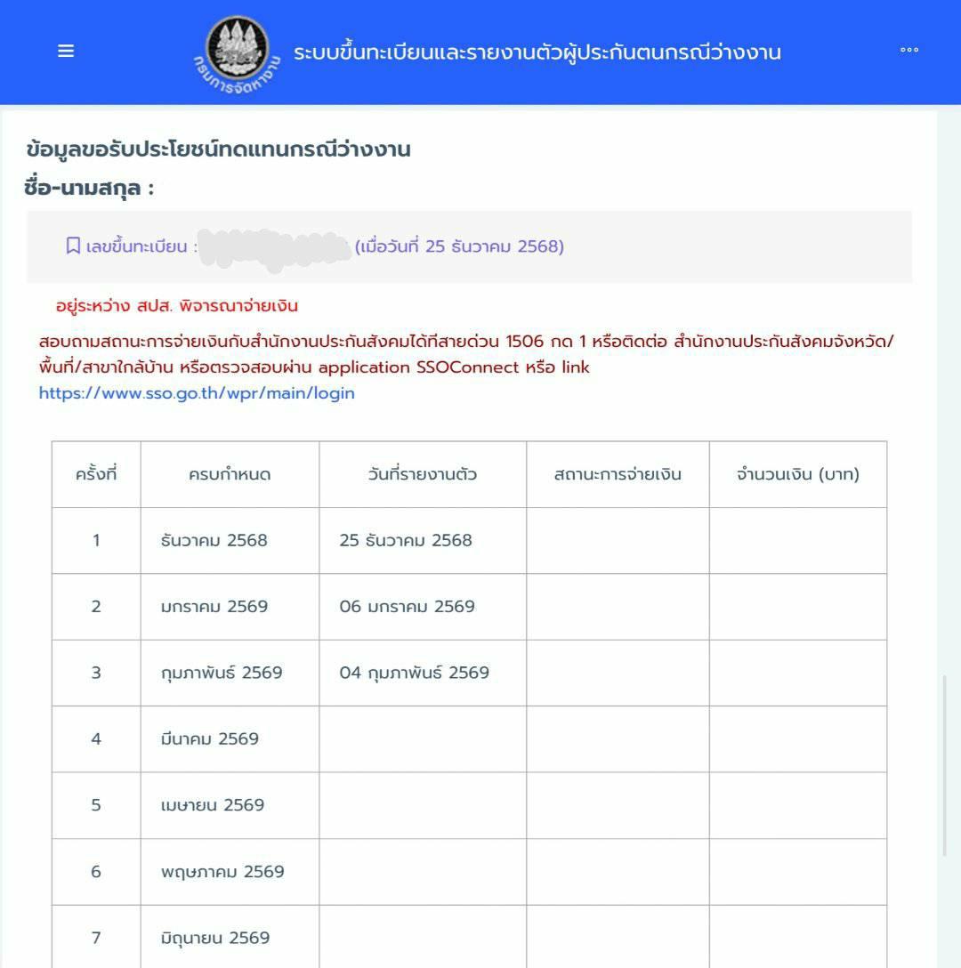` เราลาออกตั้งแต่ 25 พ.ย. 68 แล้วลงทะเบียนว่างงาน 25 ธ.ค. 68 และก็รายงานตัวมา 3 ครั้ง (ตามรูป) แล้วก็พึ่งเห็นว่าสถานะคือ อยู่ระหว่าง สปส.พิจารณาจ่ายเงิน