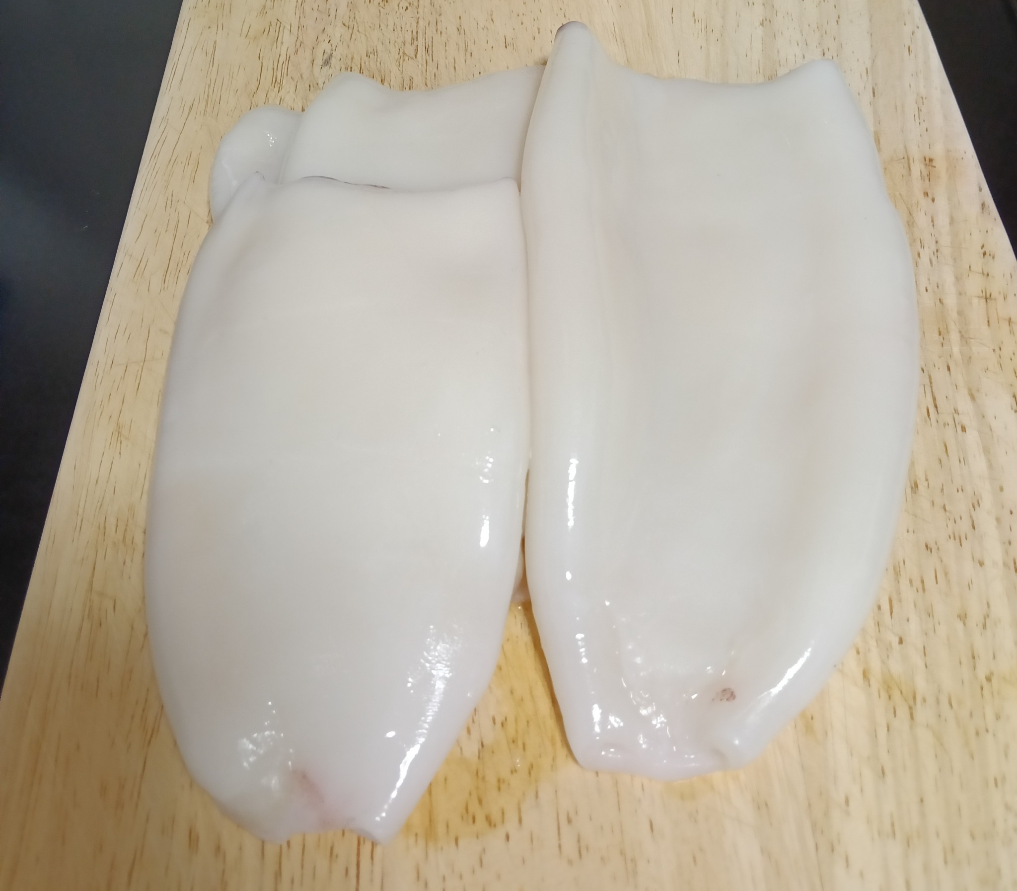 ล้างทำความสะอาดปลาหมึกด้วยน้ำเกลือ เพื่อดับกลิ่นคาว แล้วก็นำมาหั่นเป็นชิ้นพอดีคำ
