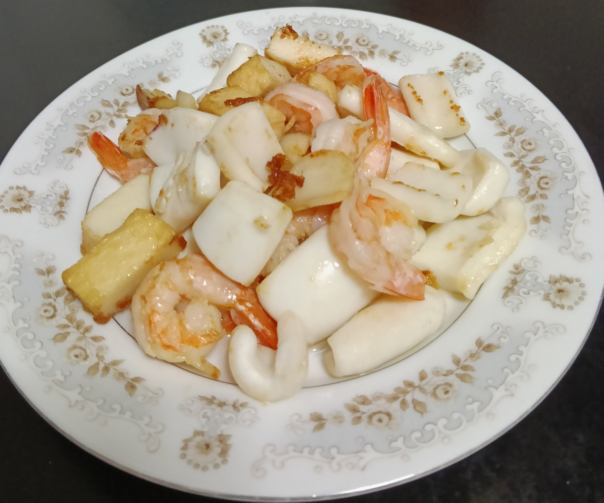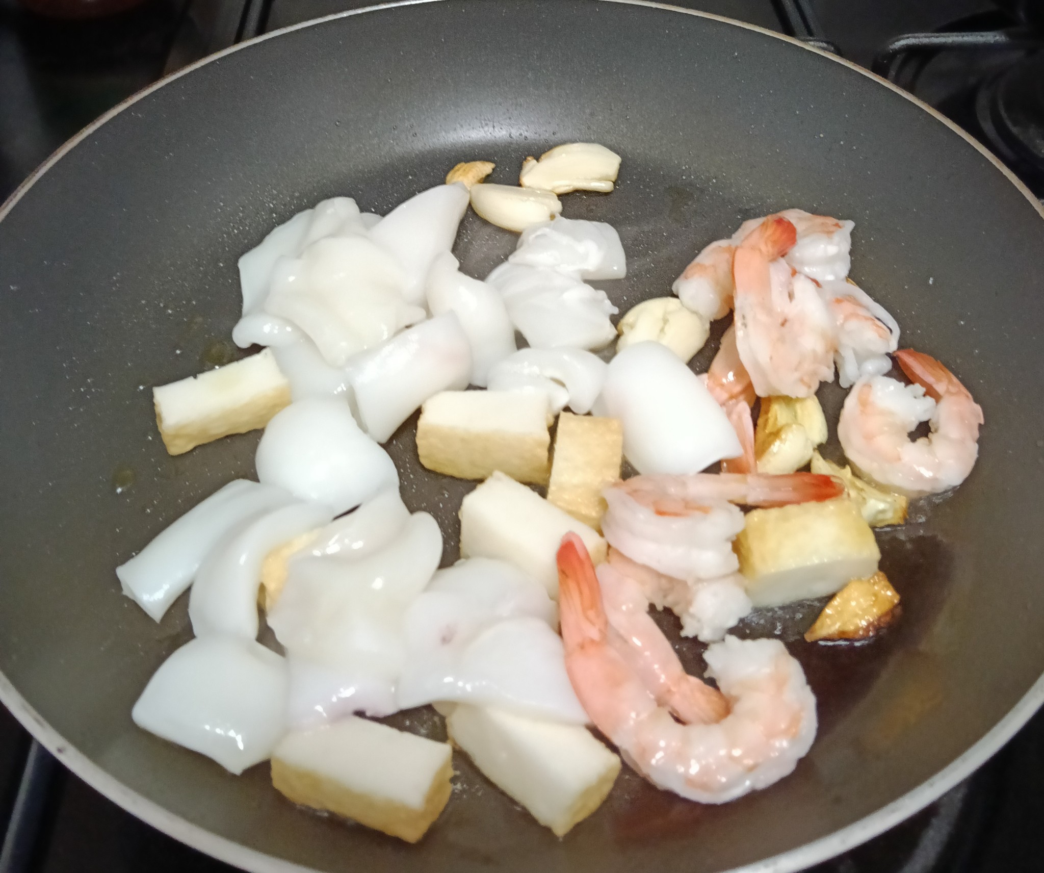 ตั้งกระทะใส่น้ำมันให้ร้อน ใส่กระเทียมลงไปผัดให้หอมๆ ตามด้วยทะเลที่เตรียมไว้