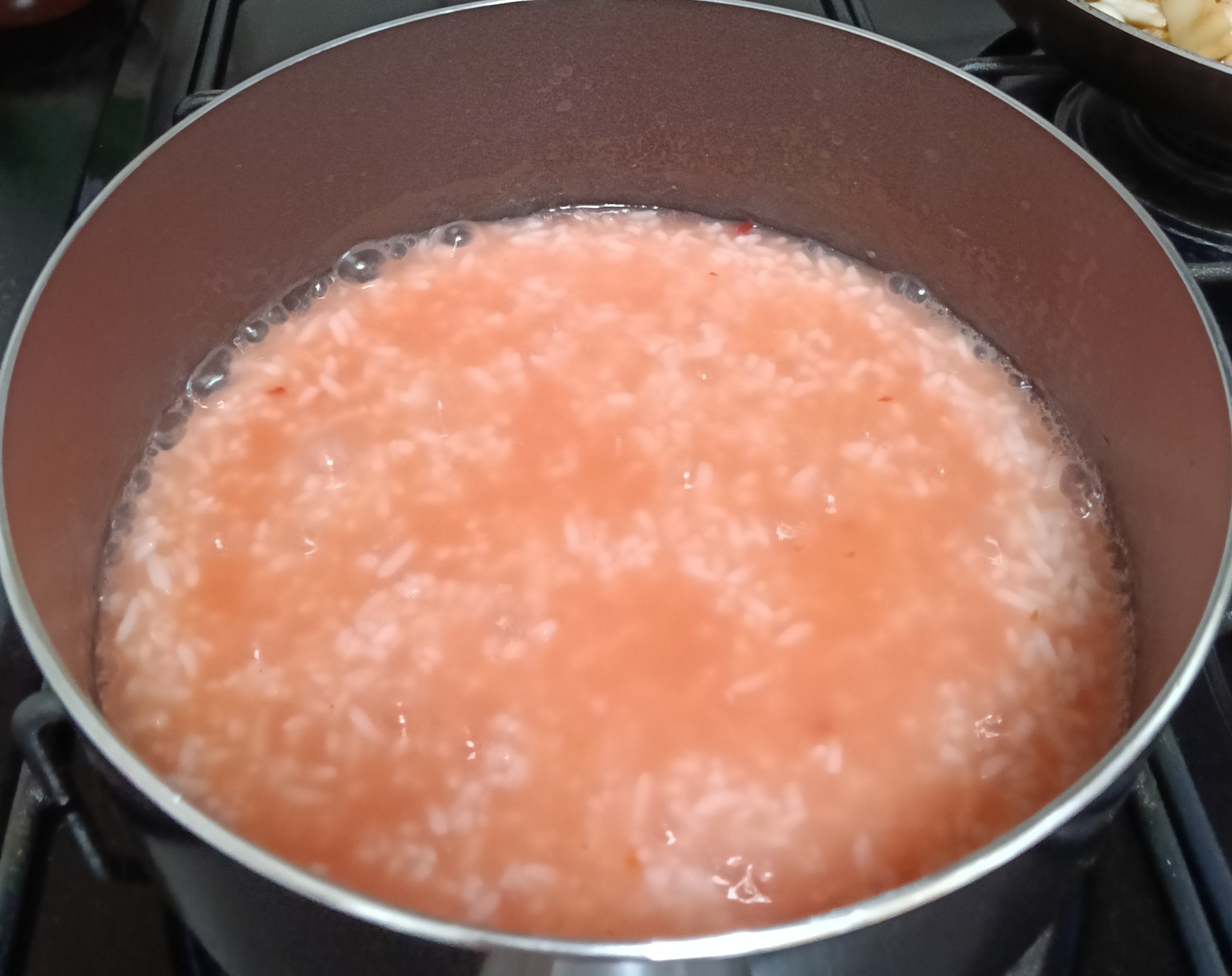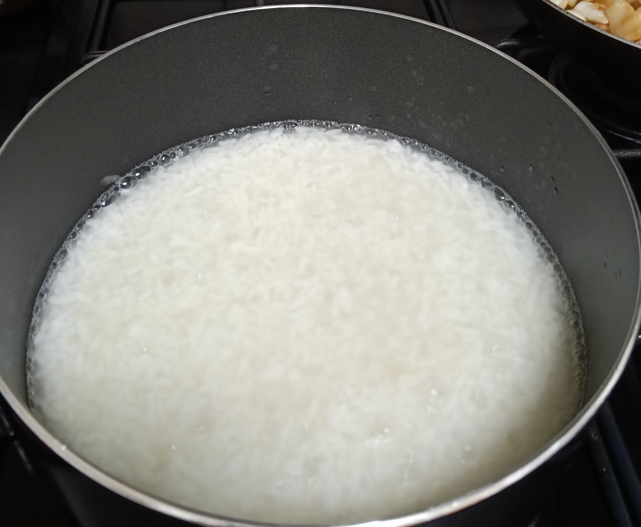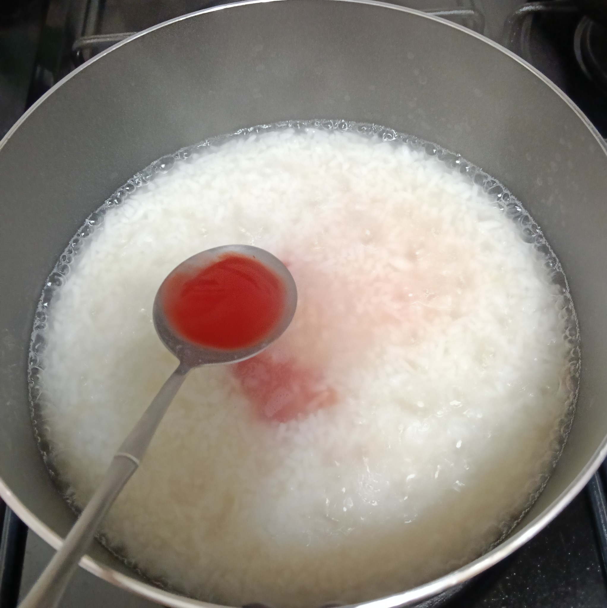 ตั้งหม้อใส่น้ำ พอน้ำเดือด ใส่ข้าวลงไป ตามด้วยผงซุปปลา