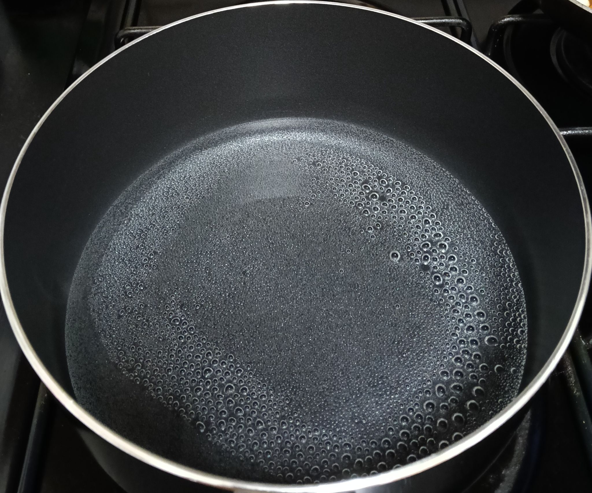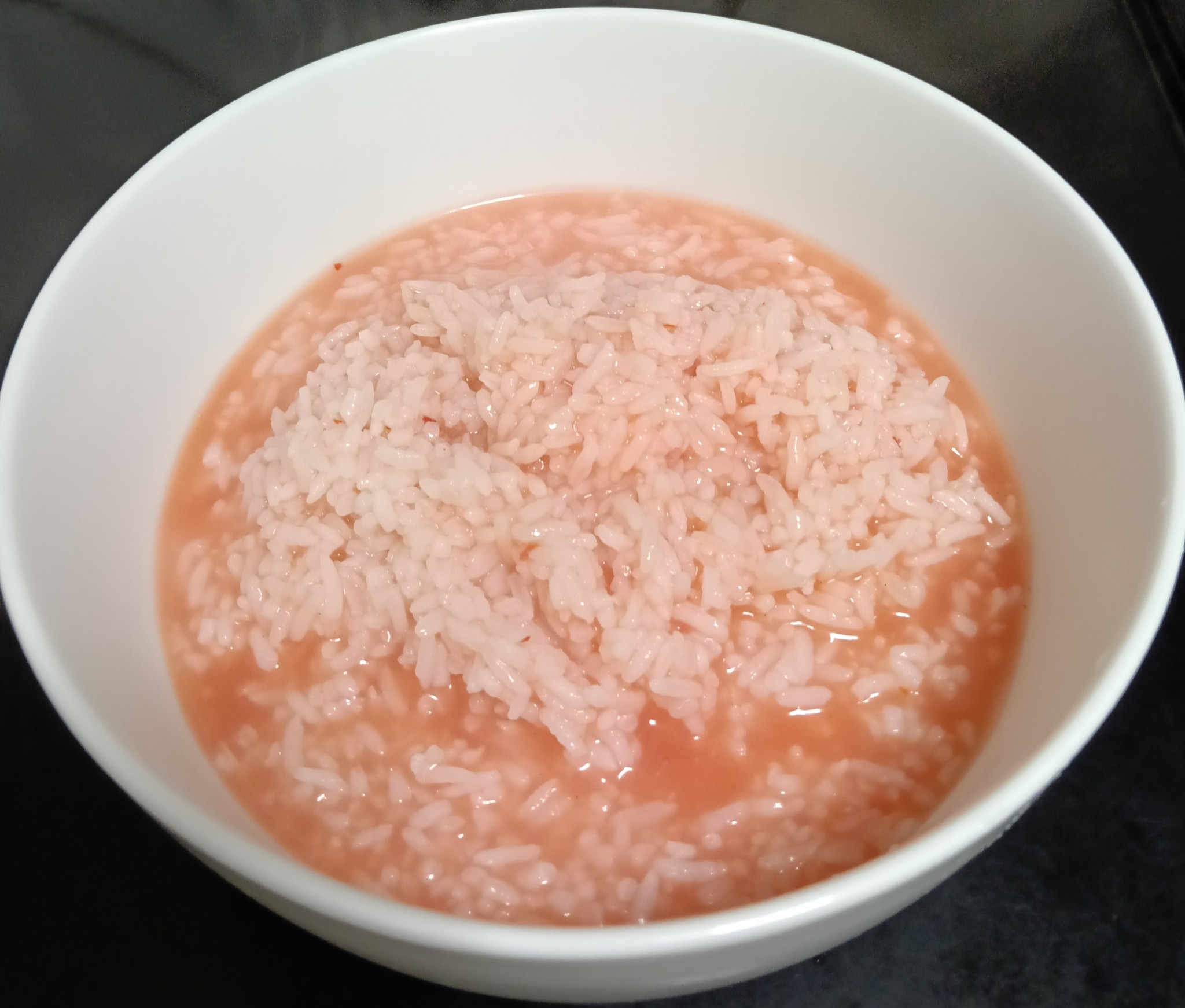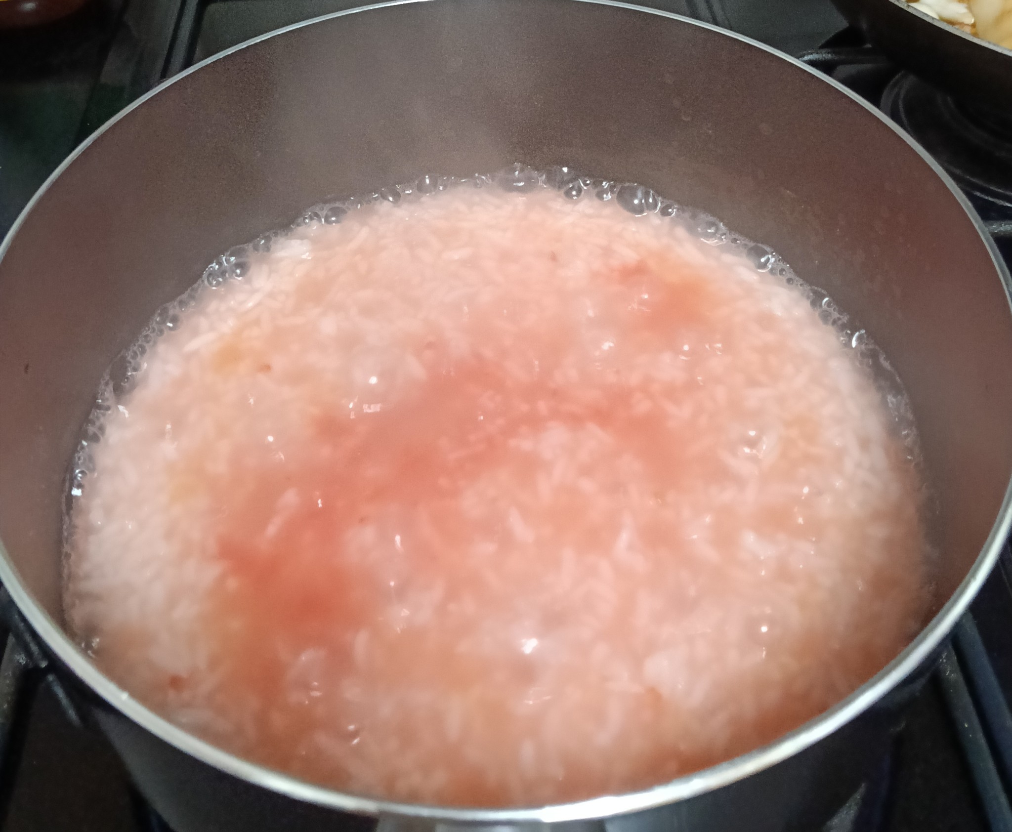 ตั้งหม้อใส่น้ำ พอน้ำเดือด ใส่ข้าวลงไป ตามด้วยผงซุปปลา