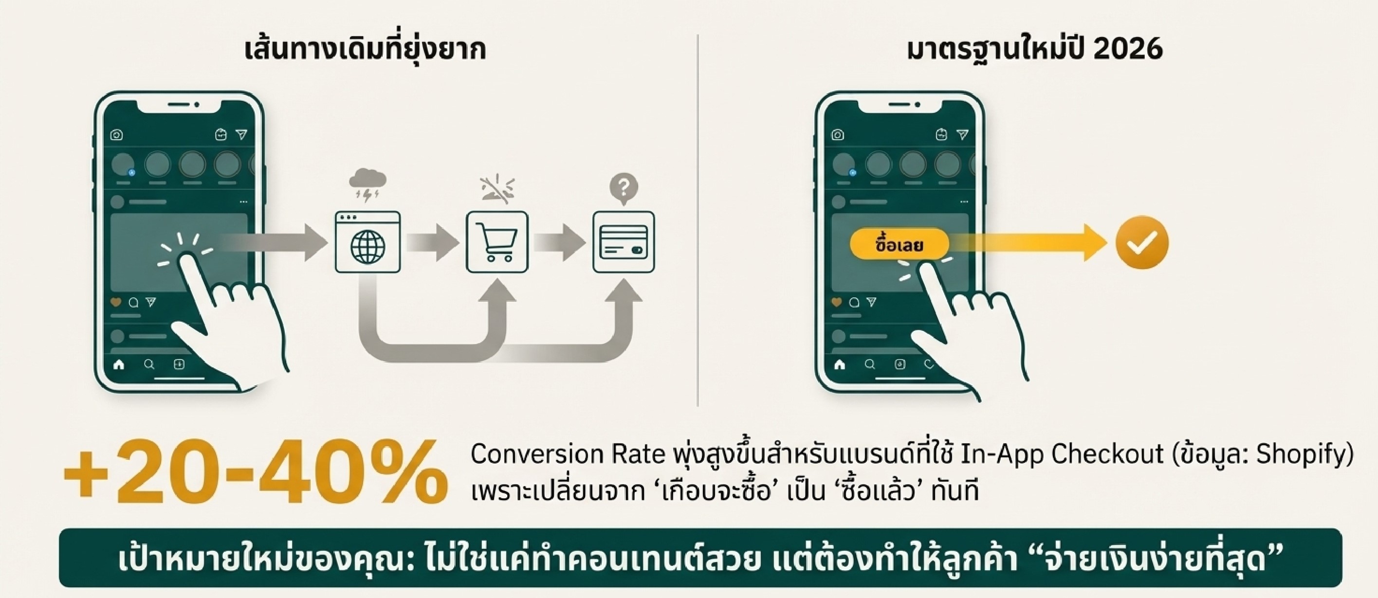เรื่องนี้ไม่ใช่เรื่องใหม่แต่ในปี 2026 มันจะกลายเป็น 'มาตรฐาน' ของการทำธุรกิจบนโซเชียลเลยทีเดียว สมัยก่อนเวลาเราอยากซื้อของจากโฆษณาใน Instagram หรือ TikTok เราต้องทำยังไงบ้าง กดลิงก์หน้า Bio วิ่งออกไปหน้าเว็บหาสินค้ากดใส่ตะกร้าใช่มั้ยครับ ไปหน้าจ่ายเงินกรอกที่อยู่โน่นนั่นนี่ วุ่นวายสุดๆ ลูกค้าหลายคนถอดใจปิดไปก่อนตั้งแต่ยังไม่ถึงหน้าจ่ายเงินด้วยซ้ำ
