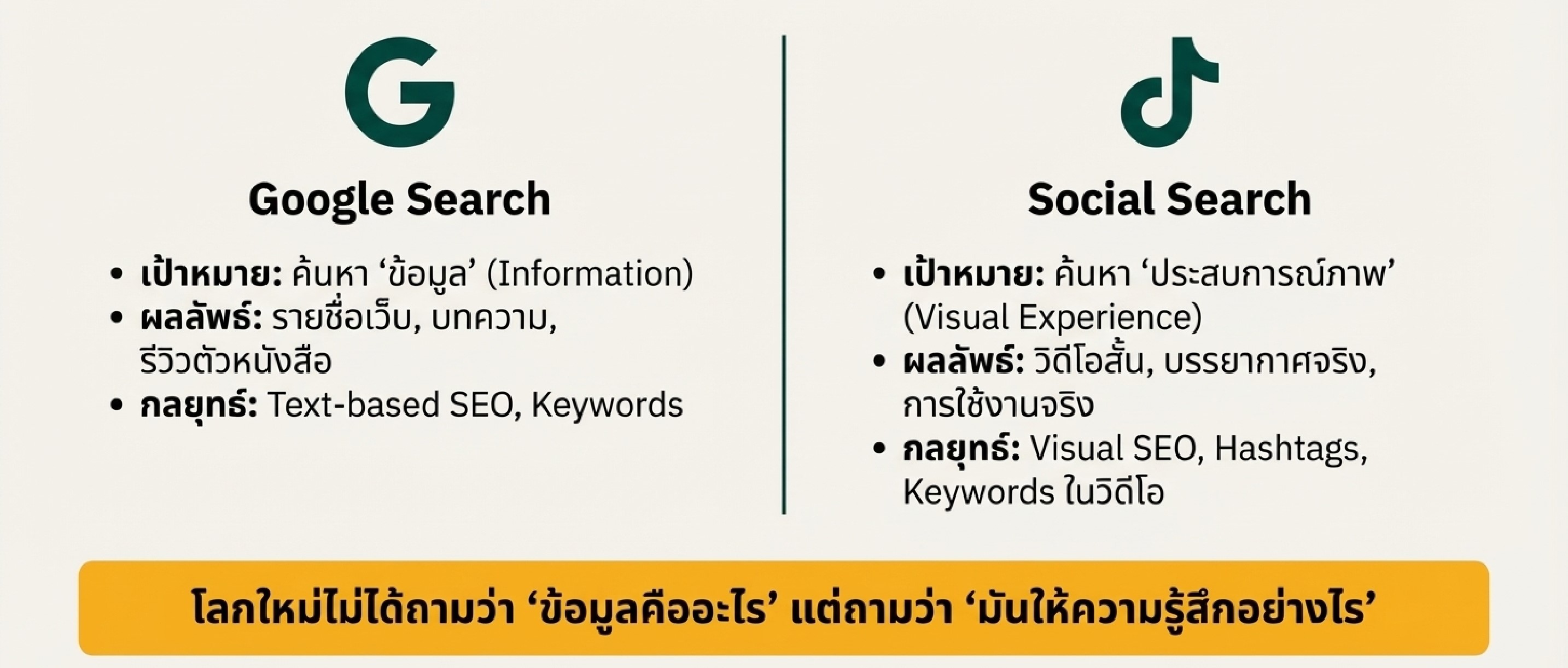 ทำไมถึงเป็นแบบนั้น ลองนึกภาพตามนะครับถ้าคุณอยากรู้ว่า "ร้านกาแฟชิลๆ ใกล้ฉัน" เมื่อก่อนคุณอาจจะพึ่ง Google Maps หรือ Google Search แต่ผลลัพธ์ที่ได้คืออะไร รายชื่อเว็บรีวิวที่เป็นตัวหนังสือหรือภาพถ่ายสวยๆ ที่อาจจะแต่งมาแล้วแต่ถ้าคุณค้นหาใน TikTok สิ่งที่คุณได้คือ "ประสบการณ์" คุณจะได้เห็นวิดีโอสั้นๆ ของคนจริงๆ ที่เดินเข้าร้านสั่งกาแฟหามุมนั่งทำงานบรรยากาศจริงๆ เสียงจริงๆ มันให้ความรู้สึก "จริง" มากกว่า คุณไม่ได้แค่อ่านรีวิว แต่คุณ "เห็น" รีวิว นี่คือการเปลี่ยนแปลงครั้งใหญ่จากการค้นหา "ข้อมูล" (Information) ไปสู่การค้นหา "ประสบการณ์ภาพ" (Visual Experience)