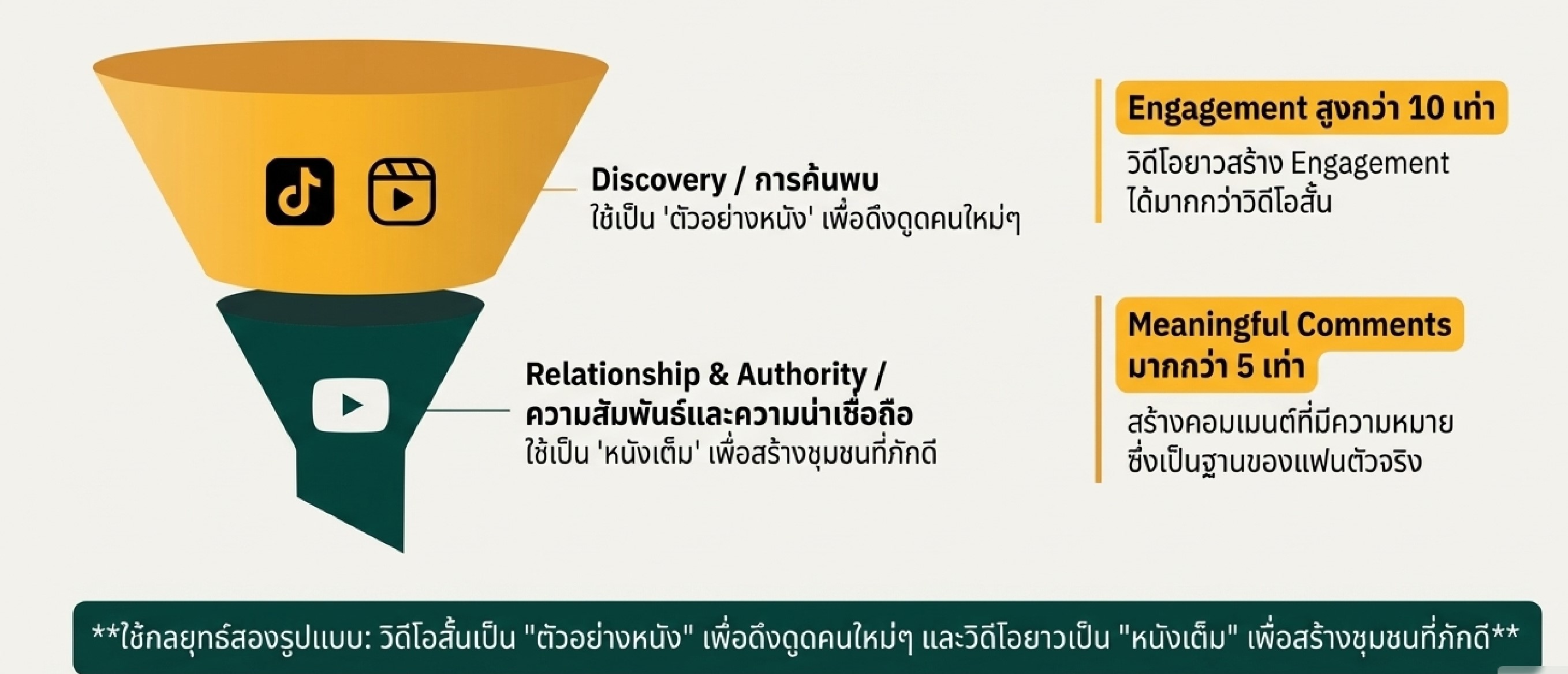 วิดีโอแบบยาว (Long-form) ใช้เป็น "เนื้อหาหลัก" หรือ "ตัวหนังเต็ม" เพื่อสร้างชุมชน สร้างความไว้ใจ และเปลี่ยนจากคนดูเป็นลูกค้าตัวจริง