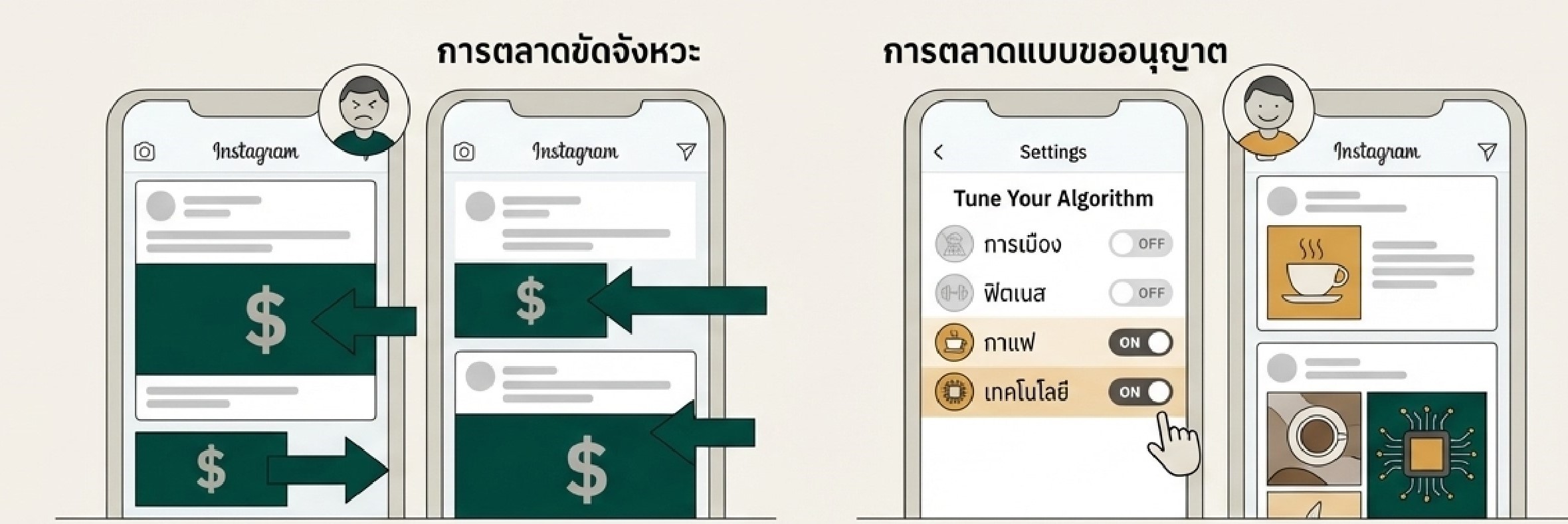 นี่มันเปลี่ยนเกมชัดๆ ในปี 2026 เราจะเห็นทุกแพลตฟอร์มมุ่งไปทางนี้มากขึ้นเพราะมันคือการ "คืนอำนาจ" ให้ผู้ใช้ สำหรับนักการตลาดนี่คือความท้าทายครั้งใหญ่คุณไม่สามารถ "ยัดเยียด" โฆษณา หรือ "ตะโกน" ใส่หน้าเขาได้อีกต่อไป ถ้าคอนเทนต์ของคุณอยู่ในหมวดหมู่ที่ผู้ใช้บล็อกไว้ เช่น เขาไม่อยากเห็นเรื่องการเงินการลงทุน ต่อให้คุณยิงแอดแม่นแค่ไหนมันก็ไปไม่ถึงเขา ทางรอดเดียวคือการทำคอนเทนต์ที่ "มีคุณค่า" และ "ตรงจุด" จนผู้ใช้ "อนุญาต" ให้คุณเข้าไปอยู่ในฟีดของเขาได้ มันคือการเปลี่ยนจาก Interruption Marketing (การตลาดแบบขัดจังหวะ) ไปสู่ Permission Marketing (การตลาดแบบขออนุญาต) อย่างสมบูรณ์แบบแบรนด์ไหนที่ทำตัวเป็น "สแปม" จะถูกคัดออกไปจากฟีดของผู้คนอย่างถาวร