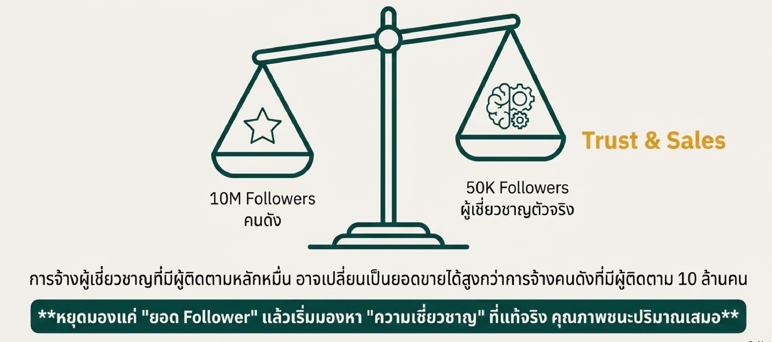 แบรนด์ค้นพบแล้วว่า การจ้างคนเหล่านี้ แม้ผู้ติดตามจะน้อยกว่า แต่ "เปลี่ยนเป็นยอดขาย" ได้สูงกว่ามาก เพราะผู้ติดตามของพวกเขาเชื่อใจในความเชี่ยวชาญนั้นแบบ 100% ถ้ากูรูด้านการเงินบอกว่าแอปนี้ดี เขาก็พร้อมจะโหลดทันทีดังนั้นนักการตลาดที่กำลังวางแผน Influencer Marketing ในปี 2026 จงหยุดมองแค่ "ยอด Follower" แล้วเริ่มมองหา "ความเชี่ยวชาญ" ที่แท้จริงแทนคุณภาพชนะปริมาณอย่างแน่นอน
