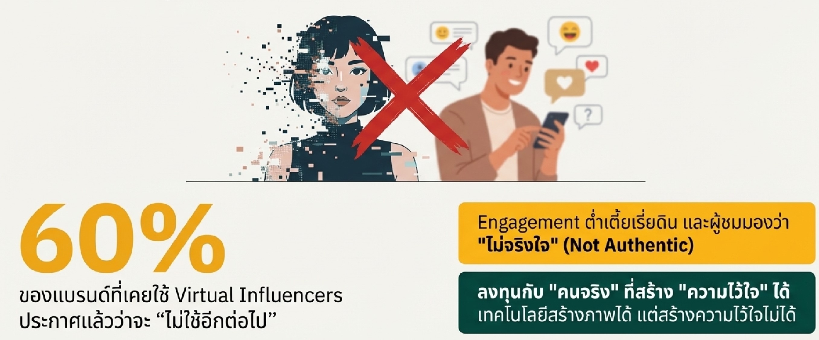 เหตุผลง่ายๆ เลยครับผู้ชมมองว่ามัน "ไม่จริงใจ" (Not authentic) ในยุคที่ผู้คนโหยหาความเชื่อมต่อที่แท้จริง การพยายามคุยกับตัวละคร CG ที่ถูกป้อนสคริปต์มา มันให้ความรู้สึกที่ "กลวง" มาก อัตราการมีส่วนร่วม (Engagement) ต่ำเตี้ยเรี่ยดิน ไม่มีใครอยากคุยด้วยเทรนด์นี้มันตอกย้ำเทรนด์ข้อที่แล้ว (Expert Influencer) ชัดเจนมากว่า สุดท้ายแล้วผู้คนเชื่อมต่อกับ "มนุษย์" ที่มีตัวตนมีความรู้สึกมีความเชี่ยวชาญและมีความผิดพลาดได้ ไม่ใช่ภาพที่สมบูรณ์แบบแต่ไร้วิญญาณ เทคโนโลยีอาจจะสร้างภาพได้ แต่สร้าง "ความไว้ใจ" ไม่ได้