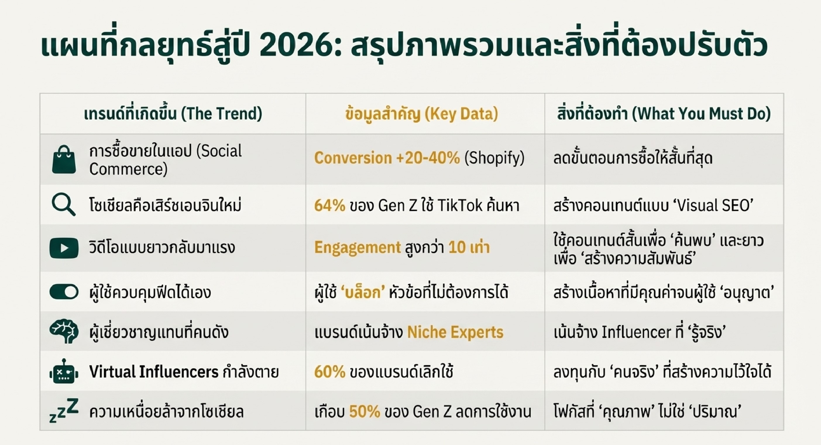 การที่ผู้ใช้เริ่มเหนื่อยล้าคือเหตุผลที่หันไปหาวิดีโอยาว (เพื่อความลึก) หันไปหาผู้เชี่ยวชาญ (เพื่อความจริง) และเริ่มควบคุมฟีดของตัวเอง (เพื่อหนีขยะ) ทุกอย่างมันเชื่อมโยงกันหมดเลยครับโลกการตลาดในปี 2026 จะเป็นโลกที่ "ความจริงใจ" "ความเชี่ยวชาญ" และ "คุณภาพ" จะเป็นตัวตัดสินผู้ชนะ ผู้บริโภคฉลาดขึ้นเหนื่อยล้าเป็นและมีอำนาจในการ "เลือก" มากขึ้น ใครที่ยังเล่นเกมแบบเดิม ๆ ทำการตลาดแบบฉาบฉวยก็อาจจะไม่มีที่ยืนในโลกโซเชียลยุคใหม่อีกต่อไป