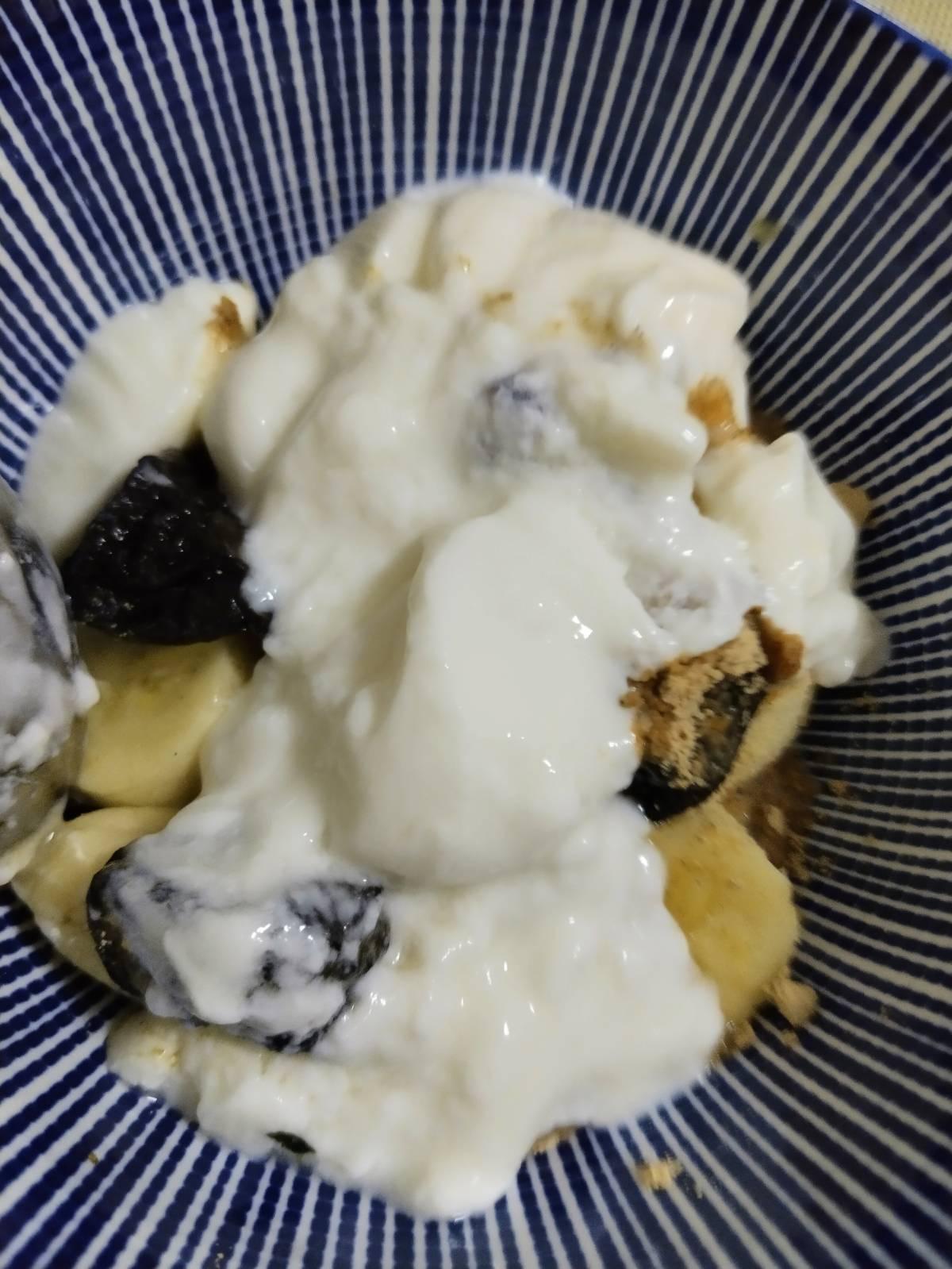 ตบท้ายด้วย กล้วยหอมโยเกิร์ต โรยผงถั่วเหลืองคั่ว คินาโกะ
