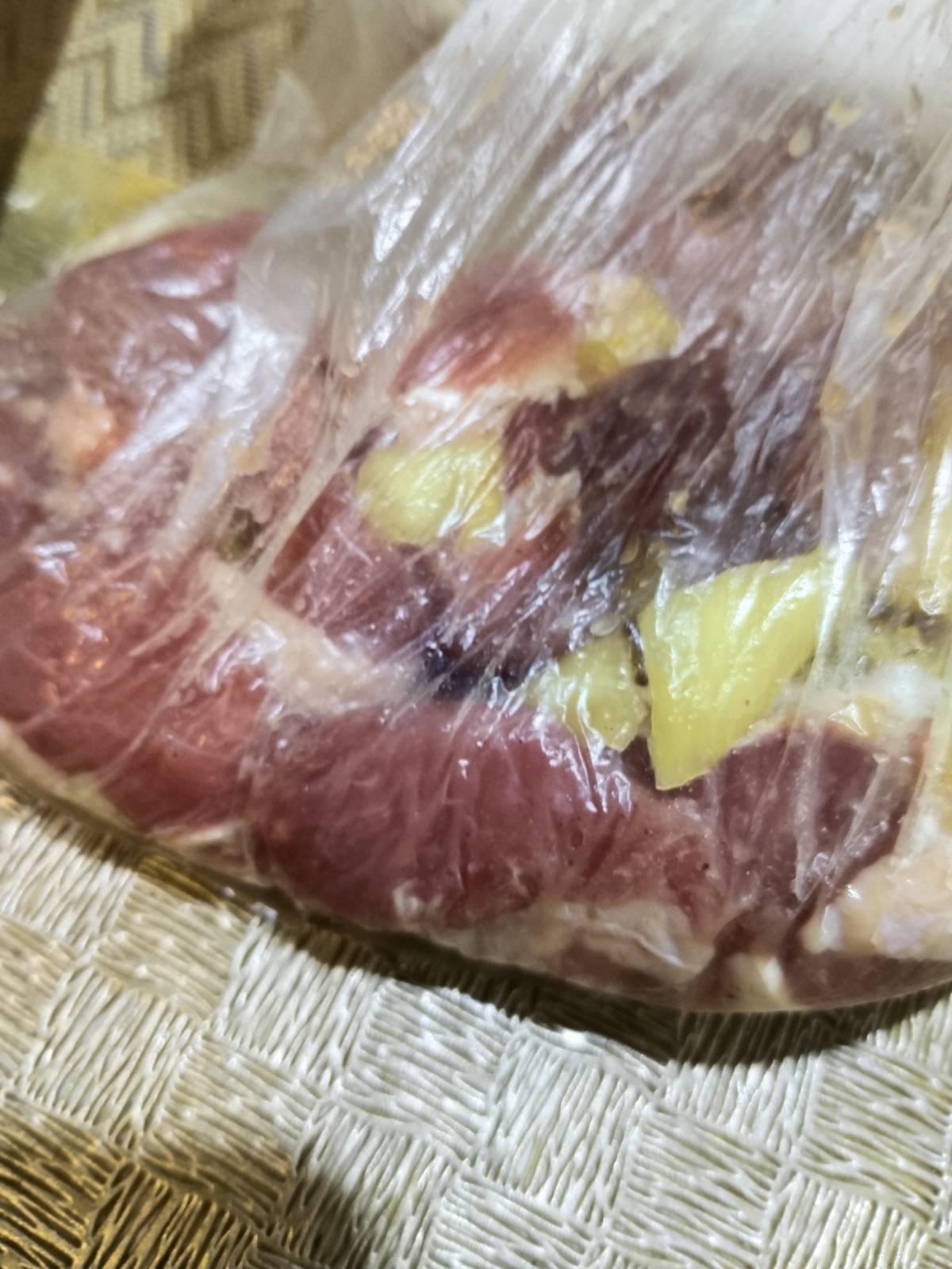 เนื่องจากเนื้อสันนอก สำหรับทำสเต็กหนามาก ดูจะเหนียวนิดนึง ใช้สับปะรดหมัก 20 นาที กับโชยุ พริกไทย สาเก