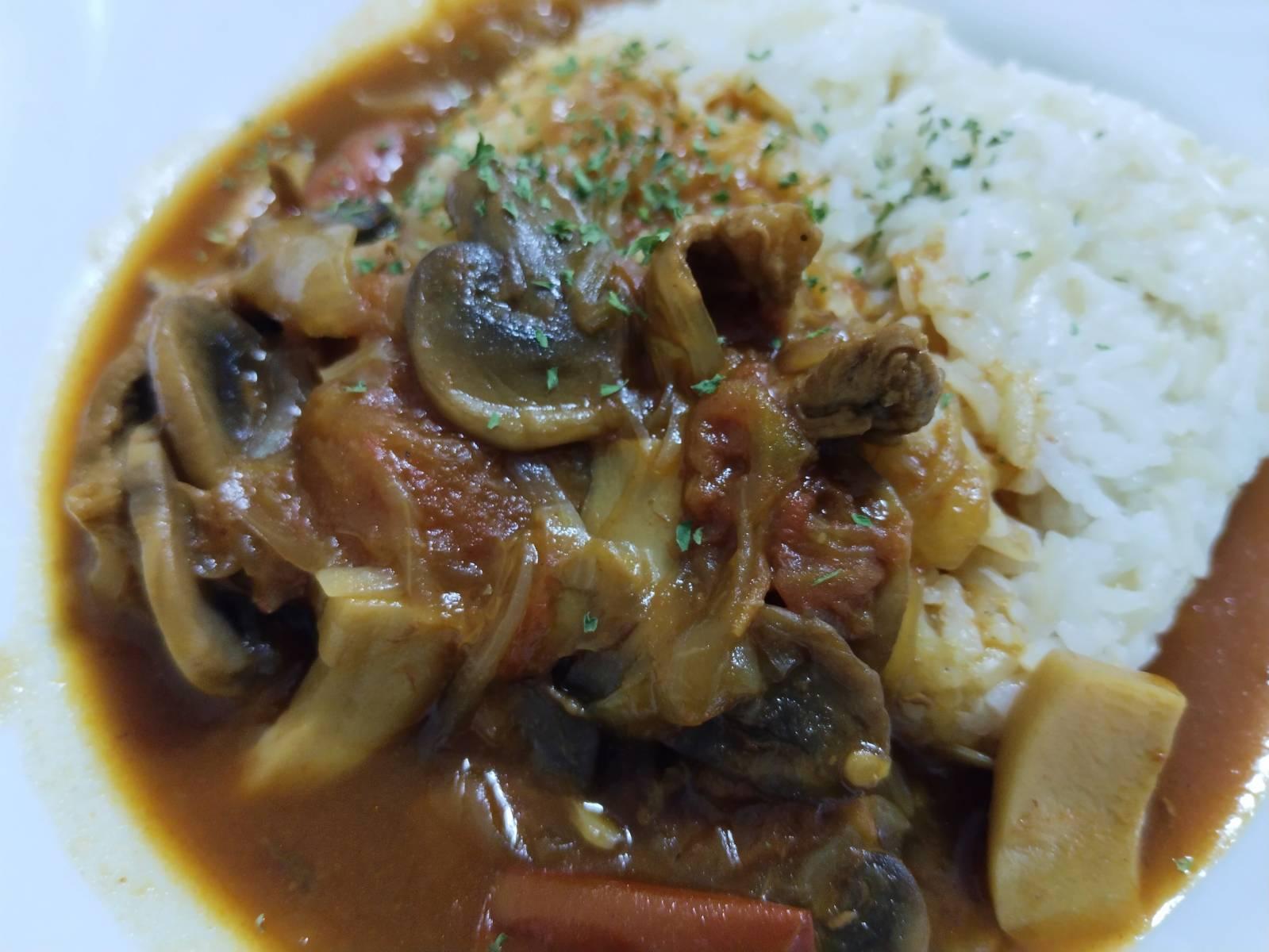 นำเนื้อหมัก มาผัดจนสุก 80% เทใส่หม้อ เติมน้ำสต๊อก หรือ ไวน์แดง เคี่ยวต่อนิดนึง ใส่มะเขือเทศหั่น 2 ลูก เคี่ยวต่อ ไฟกลาง 10-20 นาที
