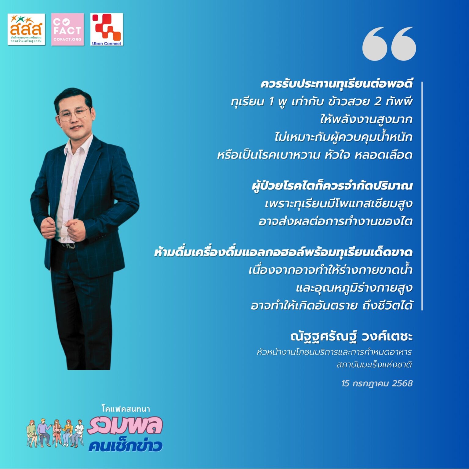 สำหรับข้อควรระวังในการบริโภคทุเรียน คุณณัฐฐศรัณฐ์กล่าวว่า ทุเรียนเป็นผลไม้ที่มีพลังงานและน้ำตาลสูงมาก โดยทุเรียน 100 กรัมให้พลังงาน120-200 กิโลแคลอรี เทียบเท่าข้าว 2 ทัพพี จึงไม่เหมาะสำหรับผู้ที่ควบคุมน้ำหนักหรือเป็นโรคเบาหวาน เพราะอาจทำให้ระดับน้ำตาลในเลือดสูงขึ้น นอกจากนี้ ทุเรียนยังมีไขมันสูง แม้จะเป็นไขมันดี แต่ผู้ป่วยโรคหัวใจและหลอดเลือดต้องระวังการบริโภคในปริมาณมาก ผู้ป่วยโรคไตก็ควรจำกัดการบริโภคเนื่องจากทุเรียนมีโพแทสเซียมสูง ซึ่งอาจส่งผลต่อการทำงานของไต สำหรับหญิงตั้งครรภ์ การกินทุเรียนมากเกินไปอาจเสี่ยงต่อเบาหวานขณะตั้งครรภ์นอกจากนี้ การกินทุเรียนพร้อมแอลกอฮอล์เป็นสิ่งที่ต้องห้ามเด็ดขาด เนื่องจากอาจทำให้ร่างกายขาดน้ำและอุณหภูมิร่างกายสูงจนถึงขั้นเสียชีวิตได้
