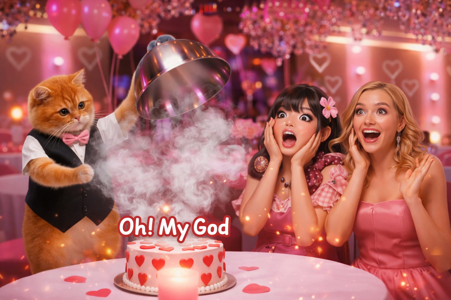 ในค่ำคืนวาเลนไทน์สุดหรู ร้านอาหารถูกตกแต่งด้วยแสงไฟและหัวใจสีชมพูอบอวลไปด้วยบรรยากาศโรแมนติก ทุกสายตาจับจ้องไปที่เค้กรูปหัวใจสีชมพูตรงหน้า ทันใดนั้นฝาครอบเค้กถูกเปิดออก ควันลึกลับพวยพุ่งขึ้นมาอย่างน่าตกใจ ทำเอาหญิงสาวถึงกับอ้าปากค้างด้วยความตื่นเต้น