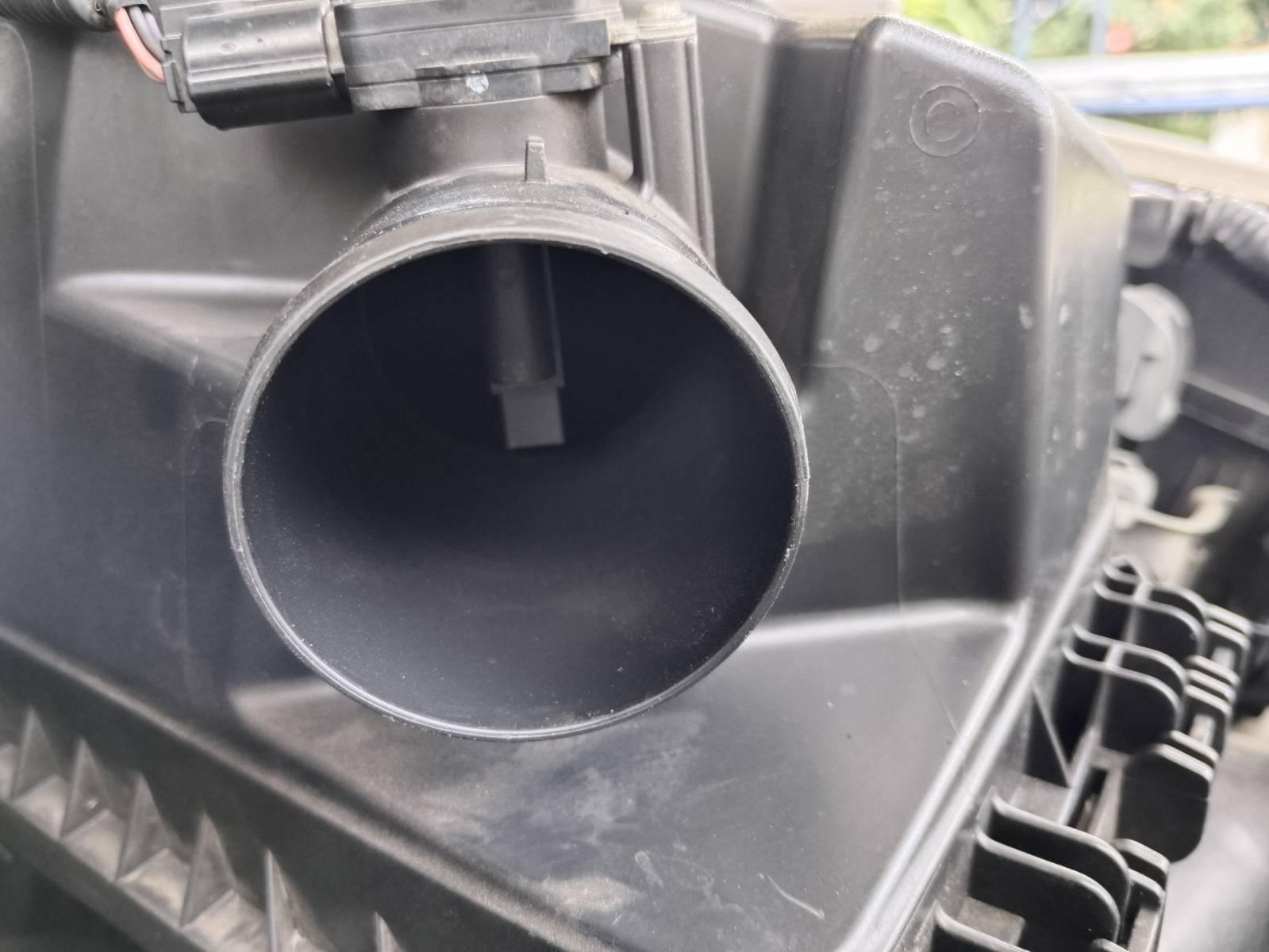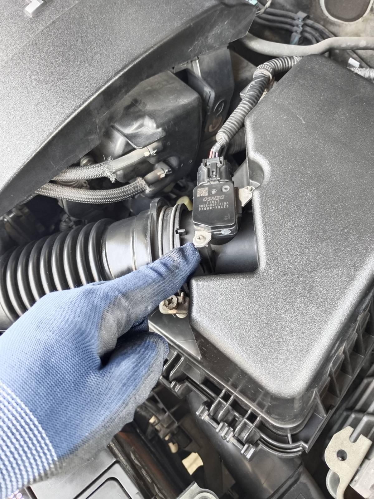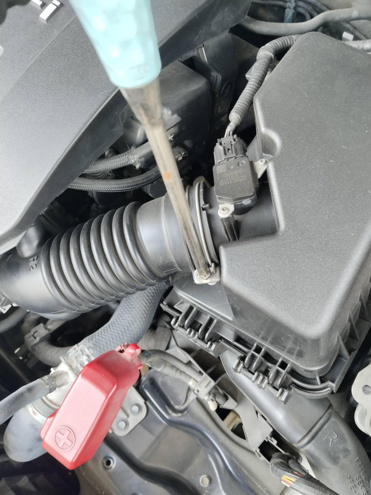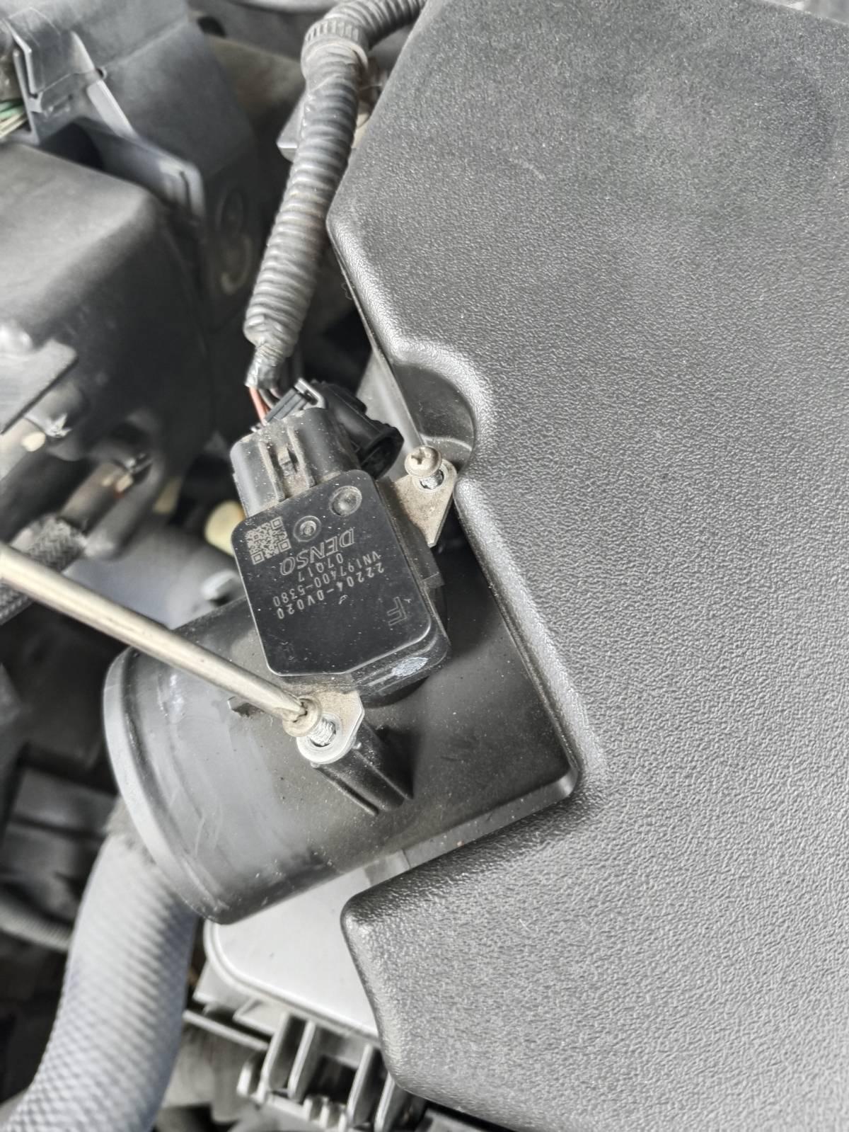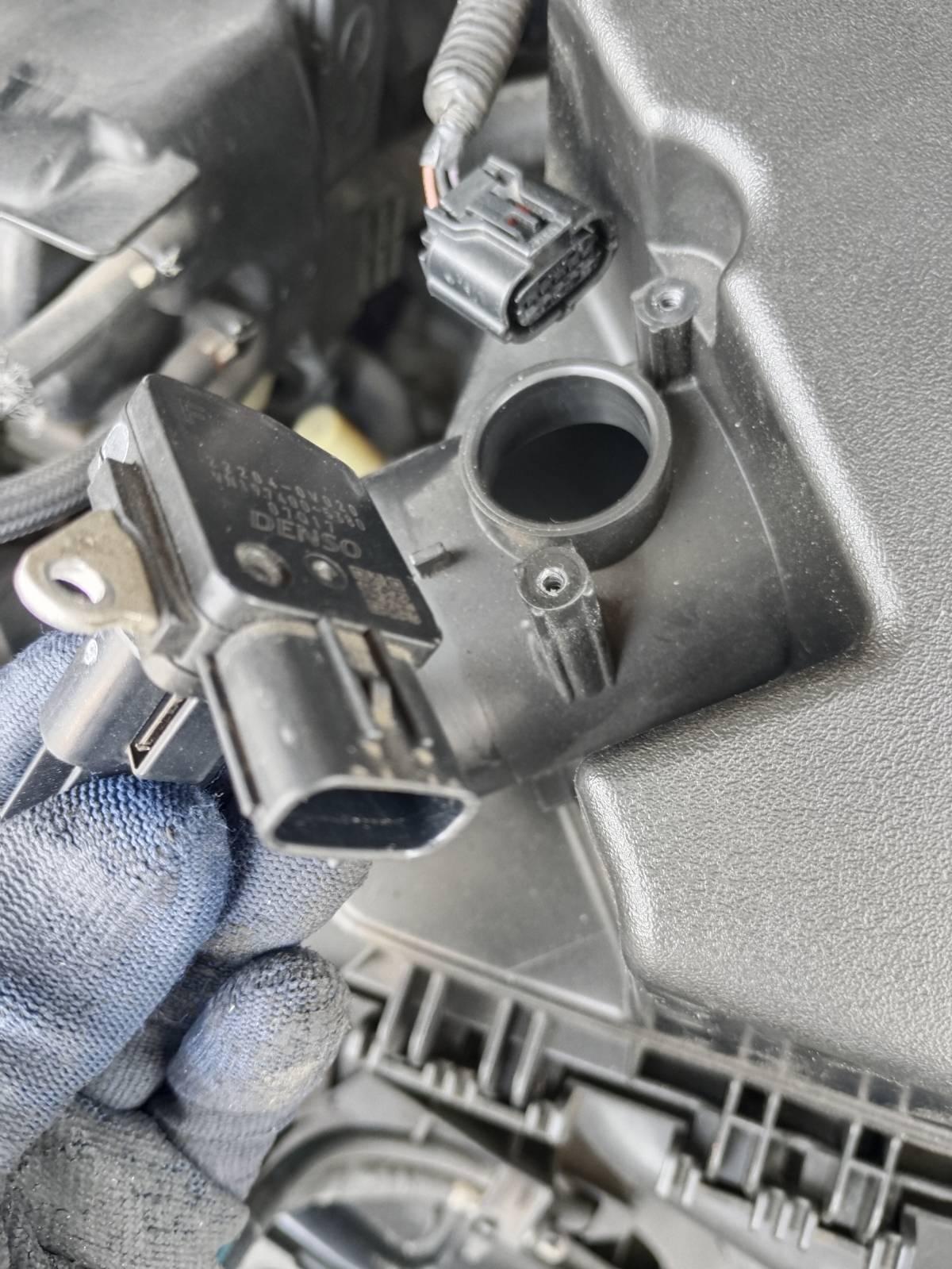 ใช้ไขควงขันแอร์โฟล์เซ็นเซอร์ ก่อนดึงออกมา ให้ปลดสายไฟที่ต่อพ่วงไว้ สภาพปลั๊กกรอบหมดแล้ว ระวังแตกหัก
