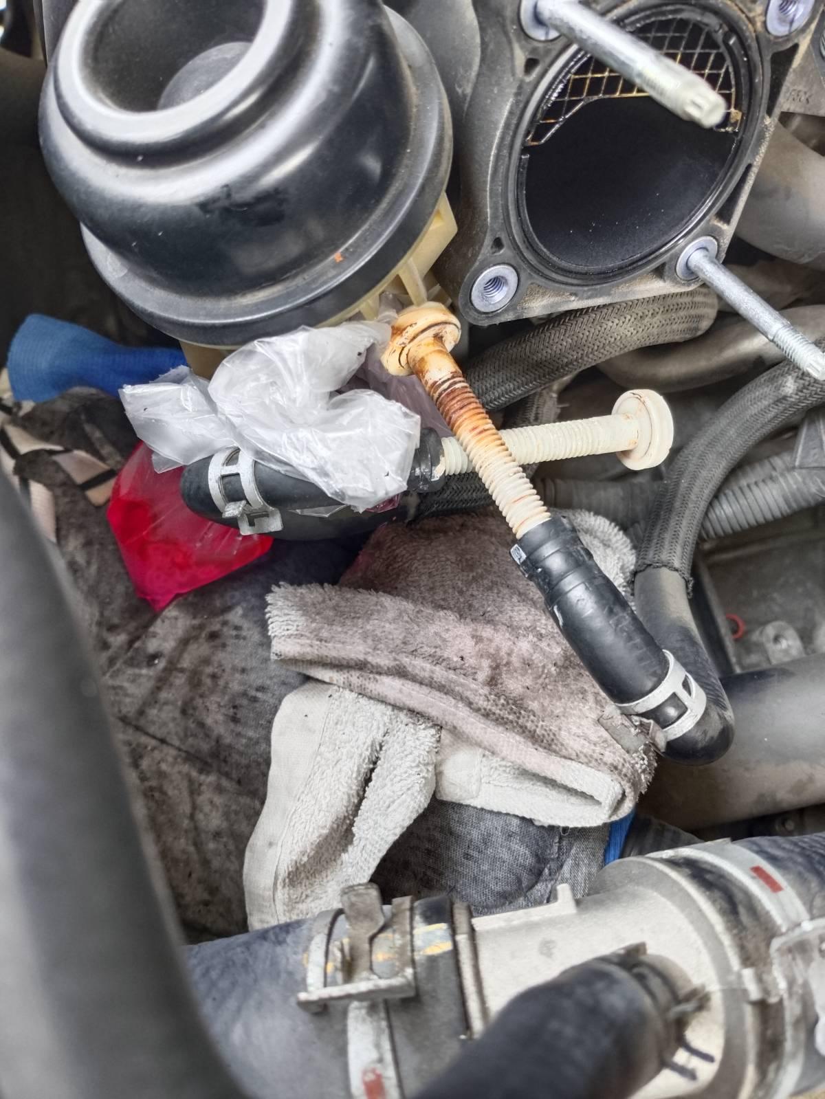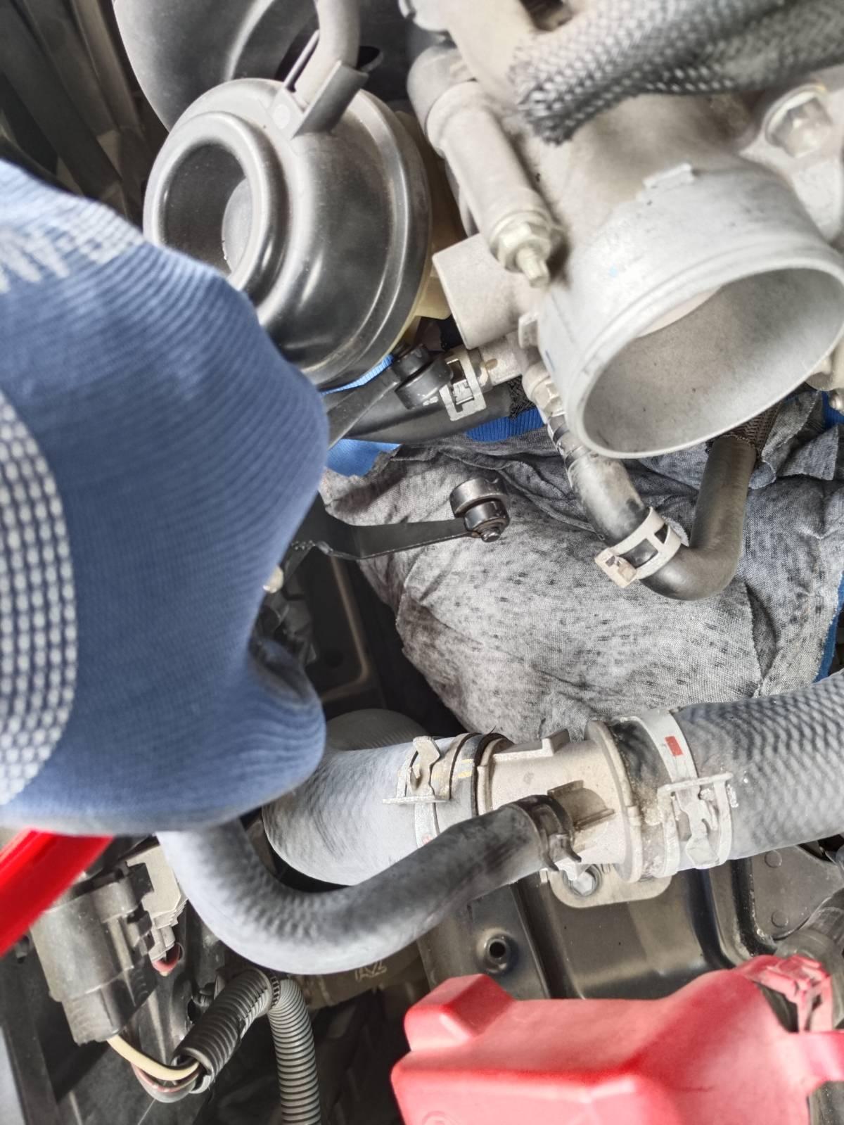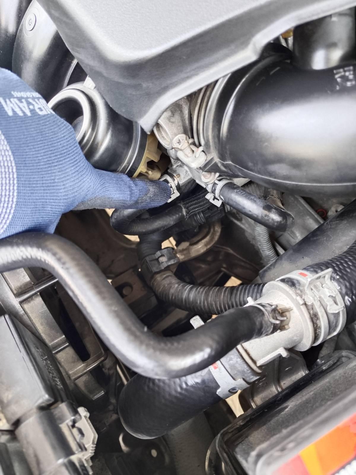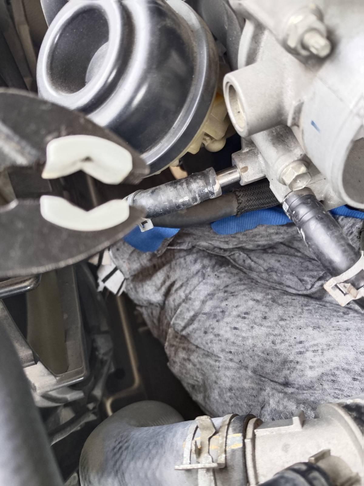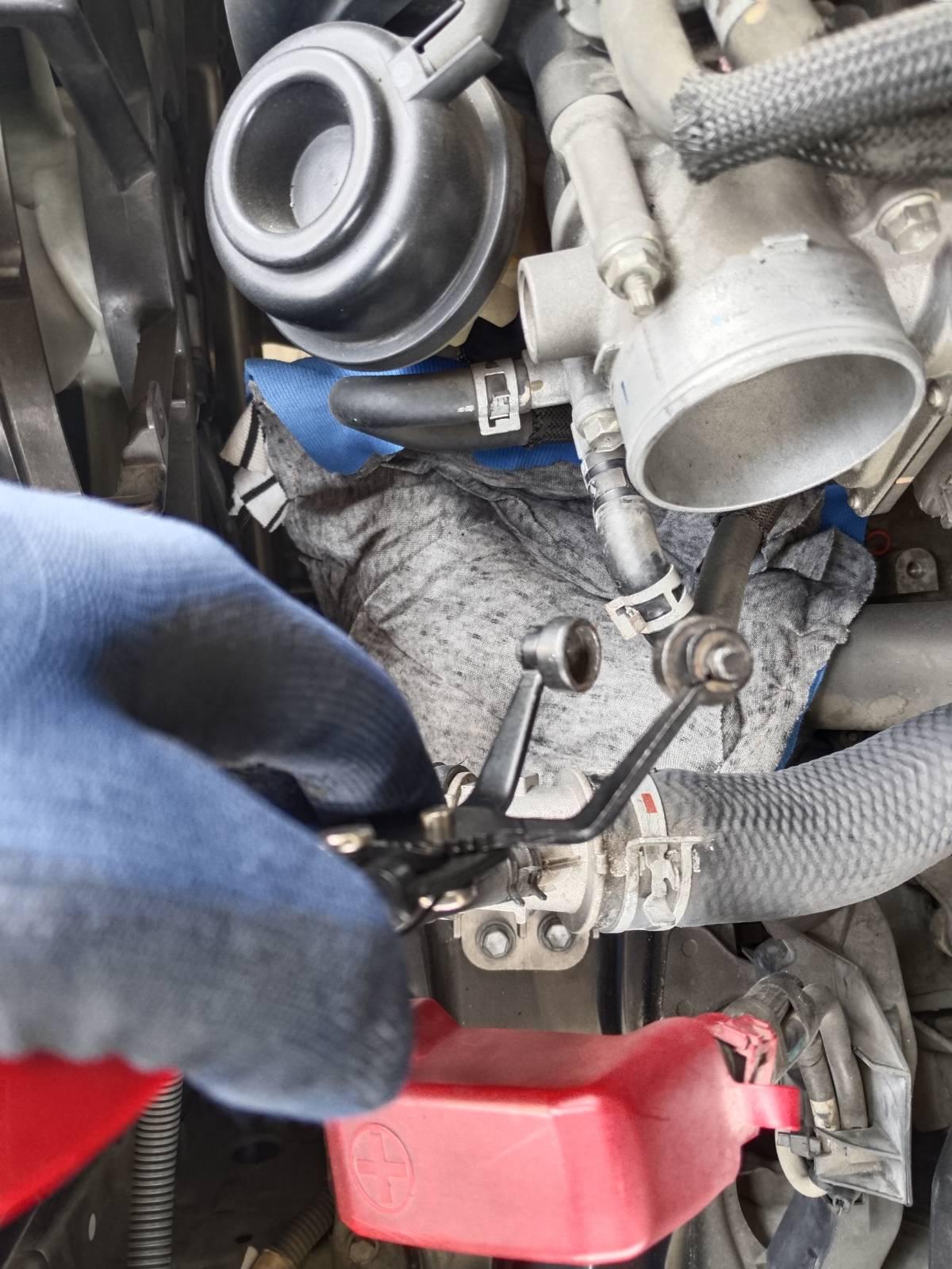 ใช้ผ้ารองใต้ท่อส่งน้ำมัน เตรียมถุงพลาสติก รองน้ำมันเชื้อเพลิง ที่ค้างในระบบ แล้วใช้คีมบีบกิ๊ป ถอยออกมา ทั้งสองเส้น ใช้โบลต์พลาสติกอุดท่อไว้ ผมใช้ขนาด 10 มม เป็นของฝาล็อคชักโครก ใช้คีมปากพลาสติก ปลดสายน้ำมันง่ายดี