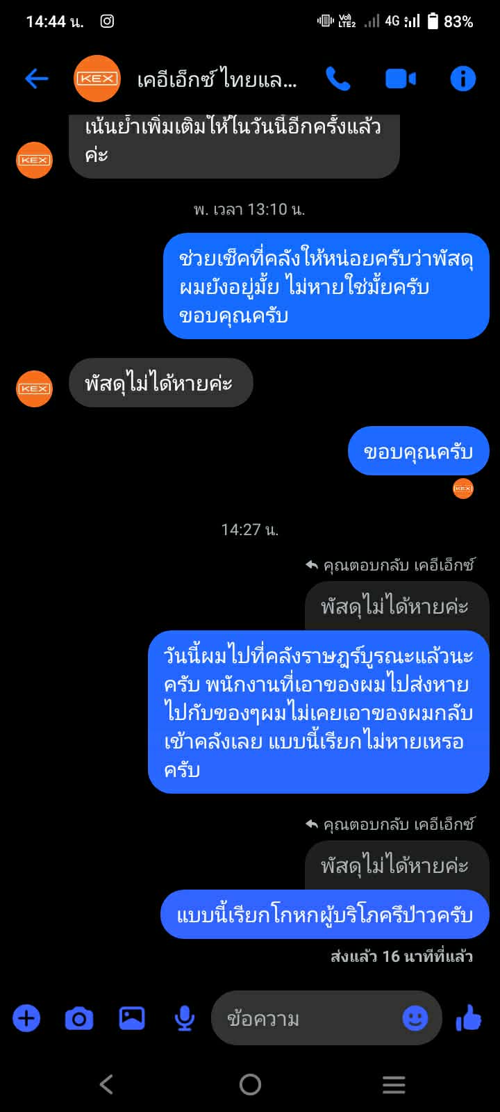 กำหนดส่งพัสดุ 03/02/69 แต่ส่งจริง 04/02/69 แต่พนักงานขอเลื่อนส่งจากนั้นก็ไม่ได้มีความคืบหน้าเลย 07/02/69 เลยไปเอาของที่คลัง ราษฎร์บูรณะ แต่พนักงานในนั้นบอก พนักงานที่ไปส่งของยังไม่เอาของกับเข้าคลังแล้วหายไปไหนไม่รู้และเหมือนจะไม่ใช่พนักงานประจำ หลังจากนั้นถึงจะมีแอดมินค่อยทักมาประสานงานให้กูยังเหมือนเดิม ไม่รู้ว่าใช่แอดมินของ KEX จริงๆมั้ย แต่ถามเค้าตลอดว่าของ กลับเข้าคลังมั้ย? ของหายมั้ยเค้าก็ตอบ พัสดุไม่ได้หาย 14/02/69 กลับไปที่คลังราษฎร์บูรณะอีกครั้งเพื่อจะไปเอาของ สรุปพนักงานที่ส่งของผมหายไปเลยพร้อมกับของๆผมเค้าจึงแนะนำให้ทำเรื่องเคลมพัสดุ แล้วที่บอกว่าพัสดุไม่หายคือยังไงแบบนี้เรียกโกหกผู้บริโภครึป่าวครับ ของก็ไม่ได้ เสียเวลา เสียความรู้สึก คว..........