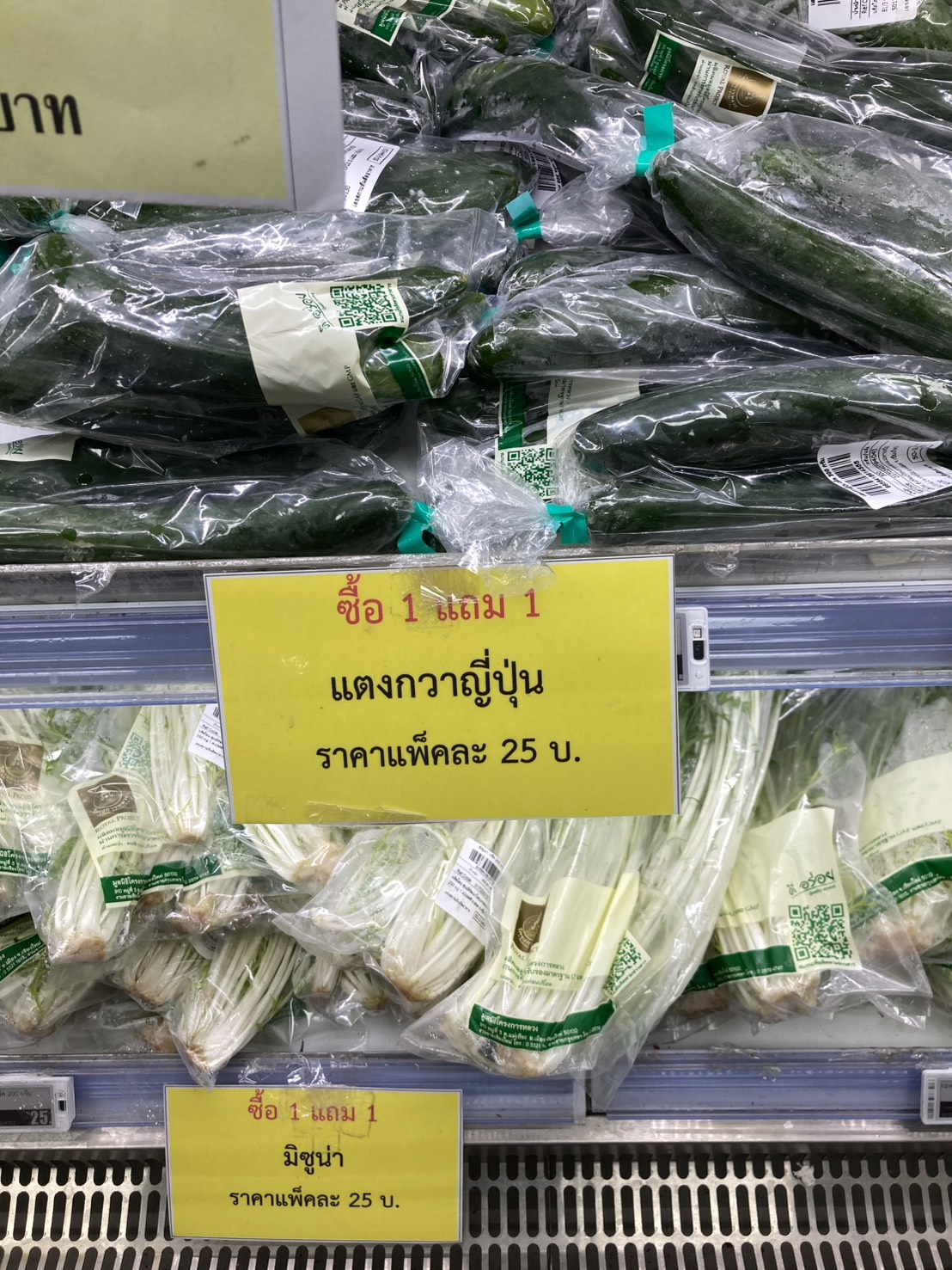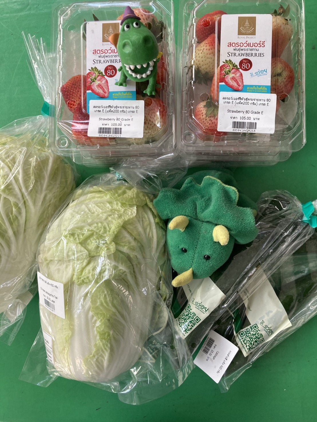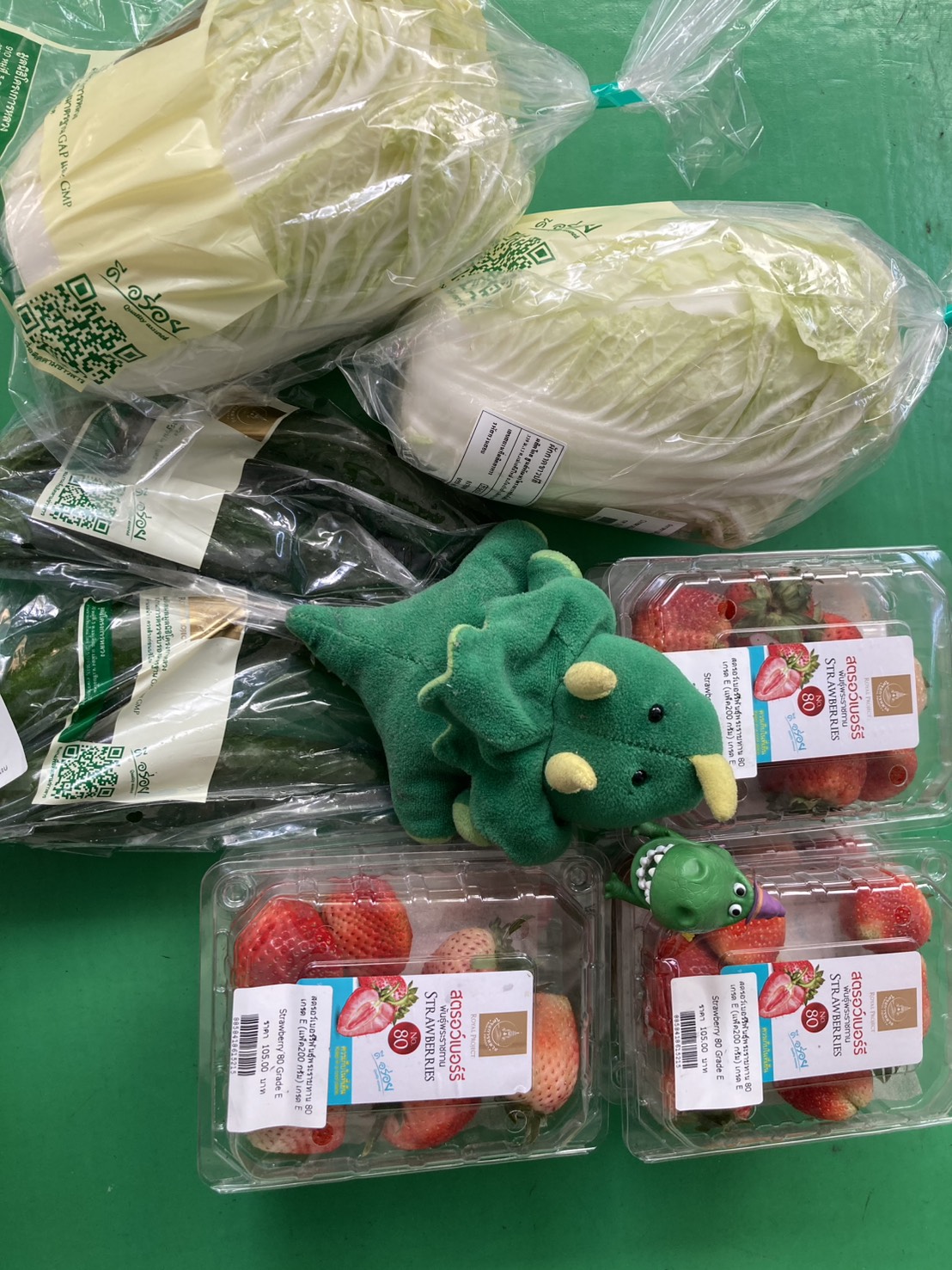 ผักกาดขาวหัวใหญ่มากๆ 1 แถม 1 ตกหัวละ 15 บาท แตงกวาญี่ปุ่น 25 บาท 1 แถม 1 สตอเบอรี่ลูกใหญ่มาก 3 กล่อง 120 บาท