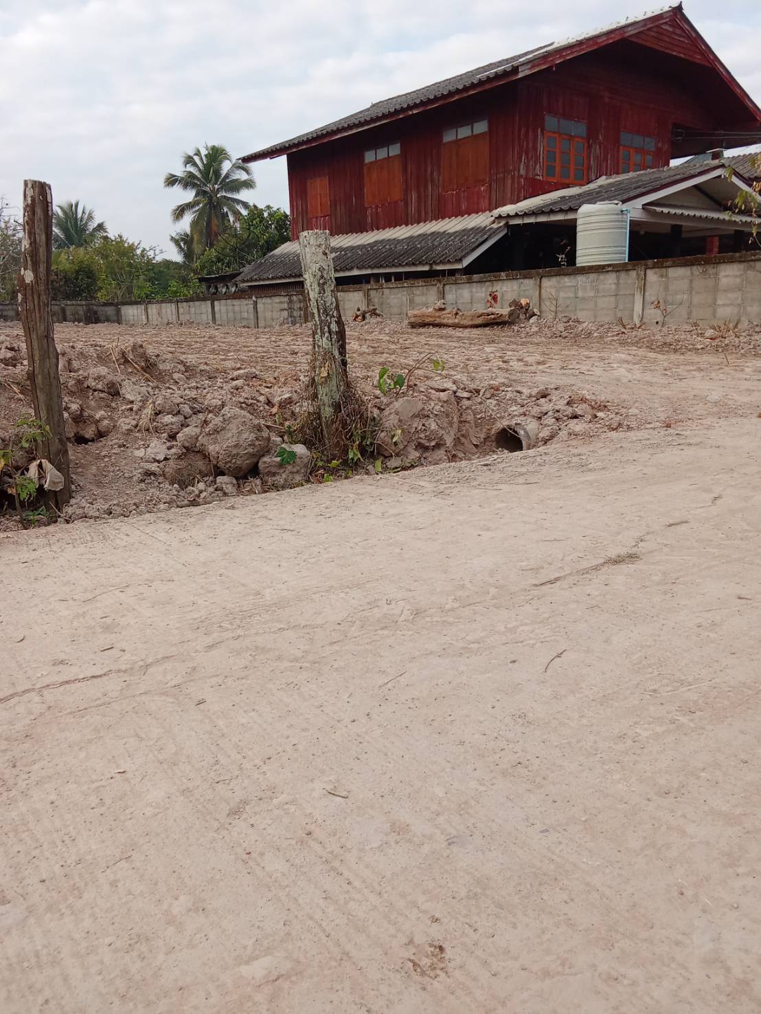 ทิศตะวันออกและใต้เป็นที่โล่ง ส่วนทิศตะวันตกมีบ้านไม้ยกสูงปลูกติดรั้วบ้านเลย (ตามรูป)