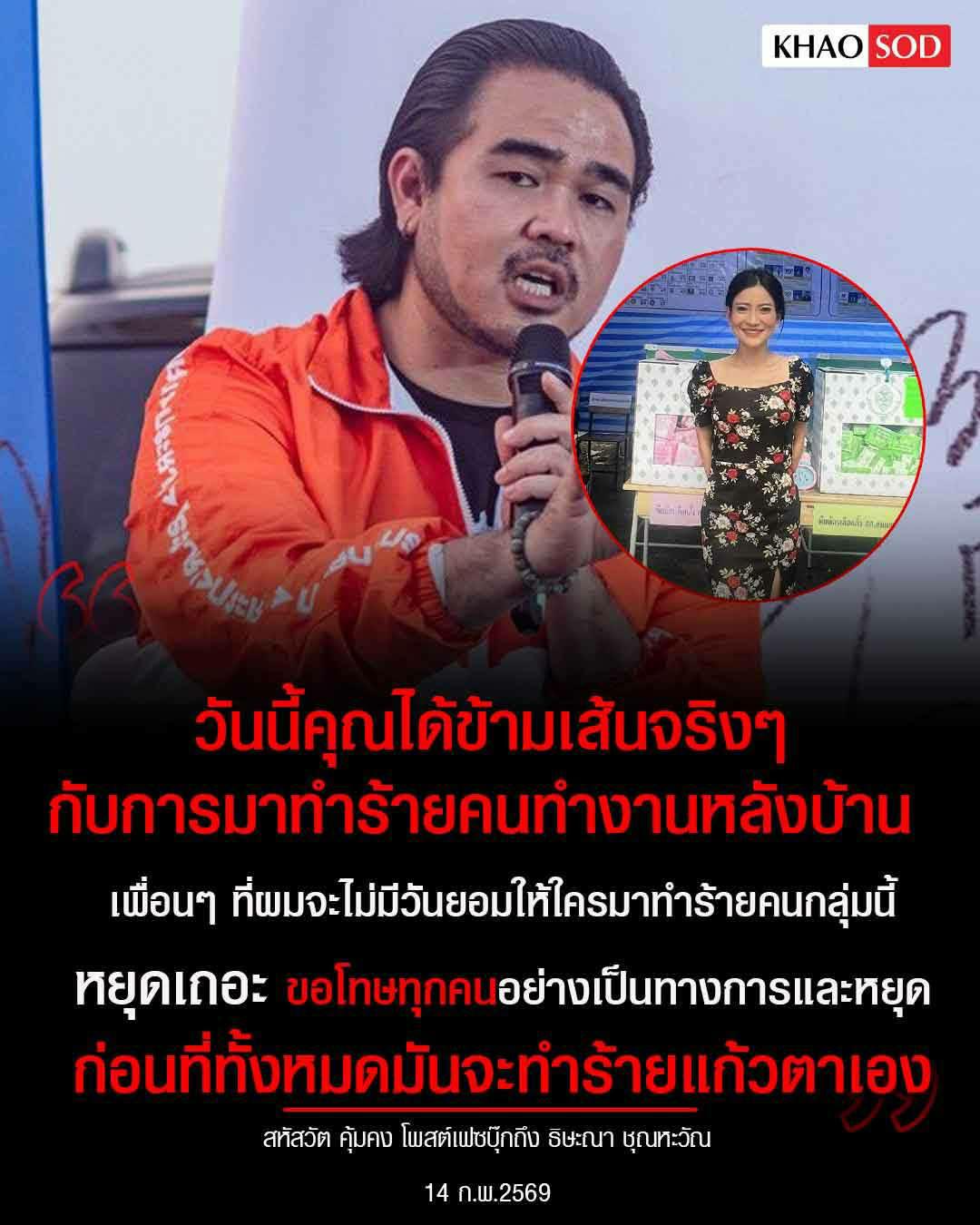 หยุดเถอะ ขอโทษทุกคนอย่างเป็นทางการและหยุด ก่อนที่ทั้งหมดมันจะทำร้ายแก้วตาเอง" สหัสวัต คุ้มคง โพสต์เฟซบุ๊ก ถึงธิษะณา ชุณหะวัณ 14 ก.พ.2569
