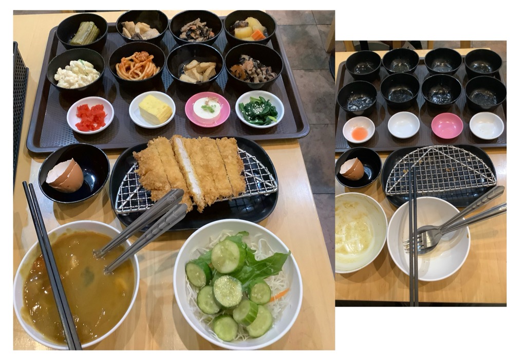 เครื่องเคียงหลัก มีแกงกะหรี่ที่อยู่แถวหน้าสุดในรูป ได้รสชาติแกงกะหรี่ญี่ปุ่น ใส่แครอท หัวหอมใหญ่ มันฝรั่ง และหมูสามชั้นนุ่มๆ