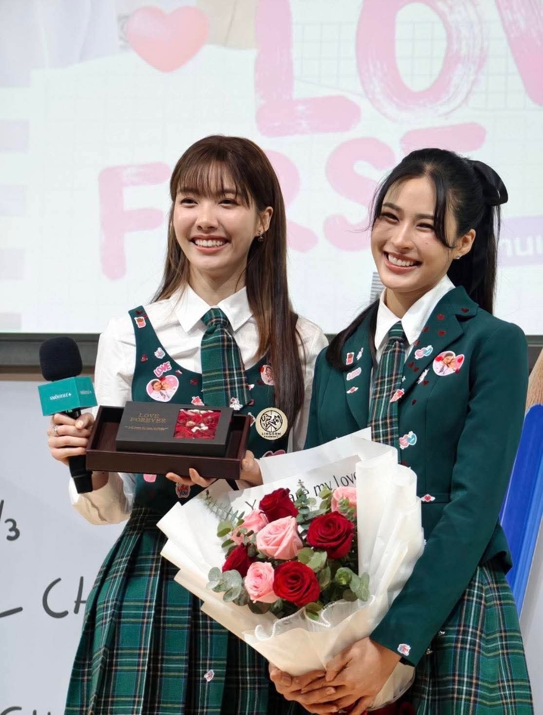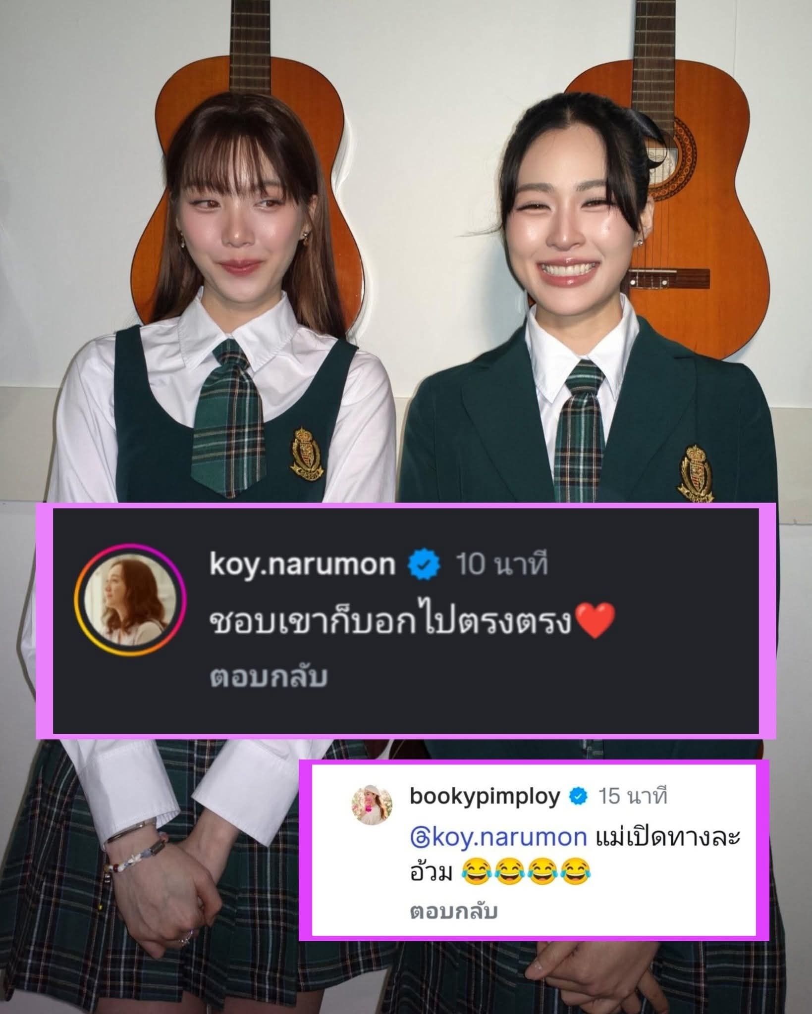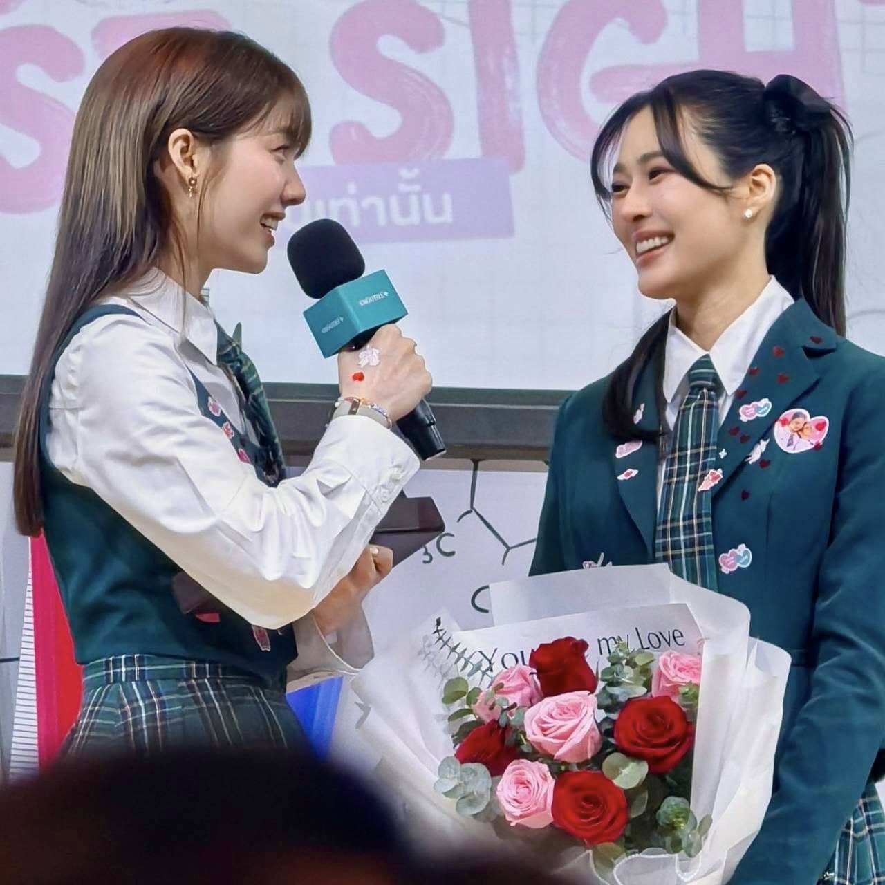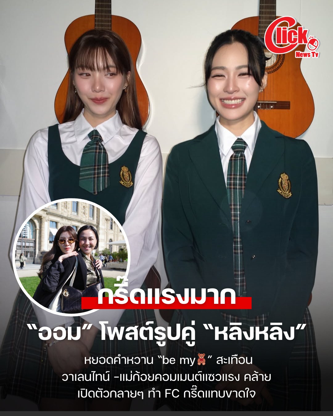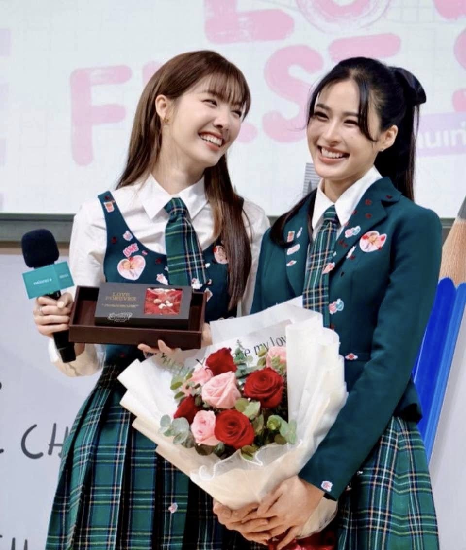 แต่ที่ทำเอาแฟนๆใจสั่นไม่แพ้ลุคใสๆของน้องออม คือรูปคู่พาฟินของ “หลิง – ออม” ที่สอดแทรกอยู่ในโพสต์ โดยช็อตเด็ดอยู่ที่น้องออมแอบมองเหล่ไปทางพี่หลิงหลิงแบบมีความหมาย ขณะที่พี่หลิงหลิงยิ้มหวานตาปิด โลกทั้งใบดูเป็นสีชมพูไปหมด โมเมนต์นี้บอกเลยว่าไม่ต้องมีคำบรรยายก็หวานทะลุจอ โดยเฉพาะแคปชั่นชวนเขิน “be my🧸” ราวกับภาพยนตร์ "สิ่งเล็กเล็กที่เรียกว่ารัก" ซีนที่ "น้องน้ำ" สารภาพรัก "พี่โชน" เป็นไหนๆ