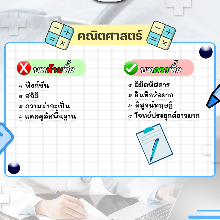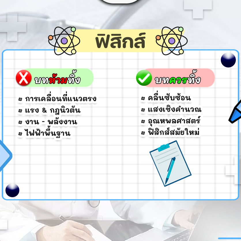 - ฟิลิกส์: ทิ้งความซับซ้อนของคลื่น แล้วมาเก็บพื้นฐานไฟฟ้าและกฎนิวตันให้แม่น ย้ำว่าต้องเป๊ะ