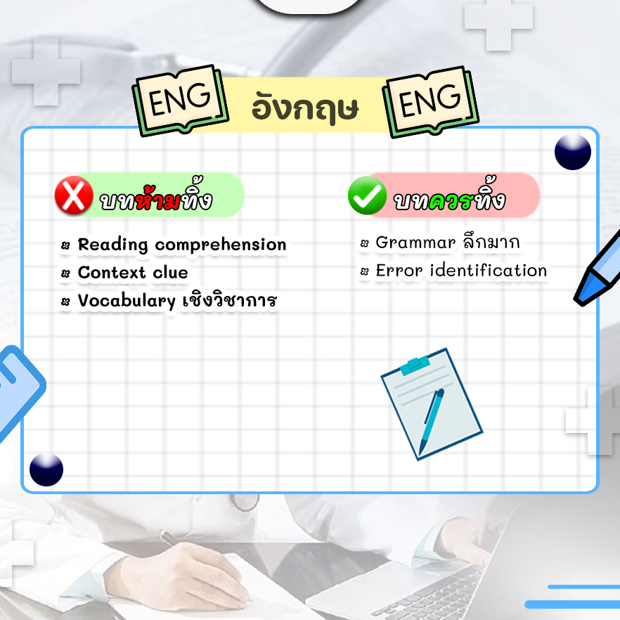 - อังกฤษ: Grammar ลึกๆ หลบไป !! เน้น Reading และ Context clue ให้ไว รับรองคะแนนพุ่ง