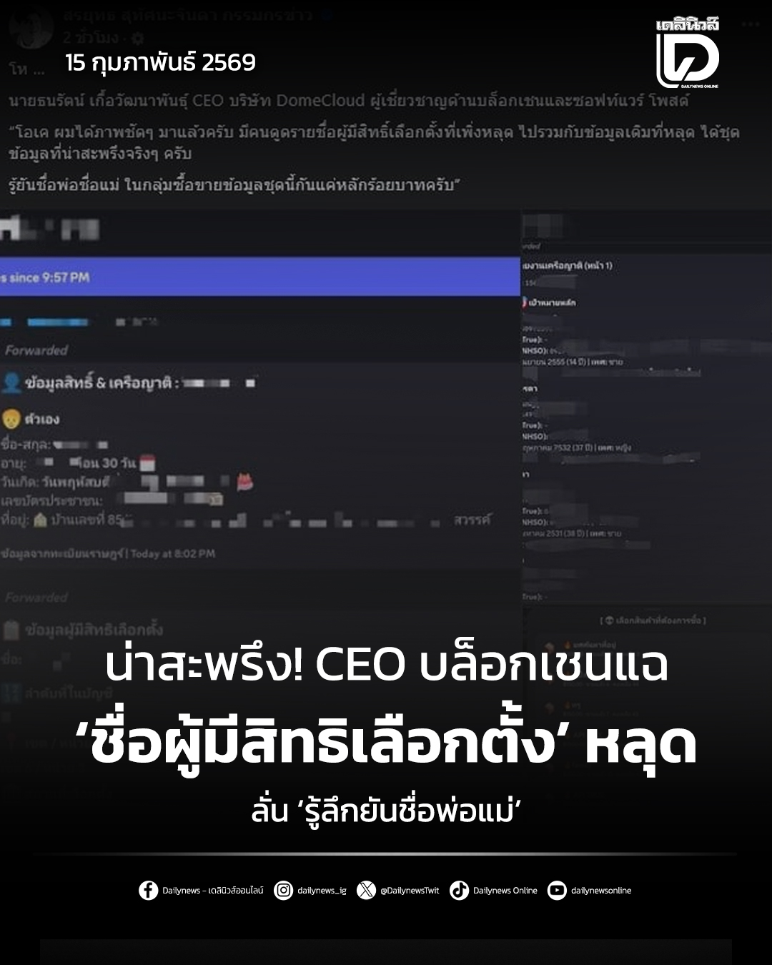 "ธนรัตน์ เกื้อวัฒนาพันธุ์" CEO DomeCloud ผู้เชี่ยวชาญด้านบล็อกเชน แฉภาพชัด มีมือดีดูดข้อมูลรายชื่อผู้มีสิทธิเลือกตั้ง ผสมฐานข้อมูลเดิม ลั่นรู้ยันชื่อพ่อแม่ แพร่ในกลุ่มซื้อขายตลาดมืดราคาถูกแค่หลักร้อยบาท