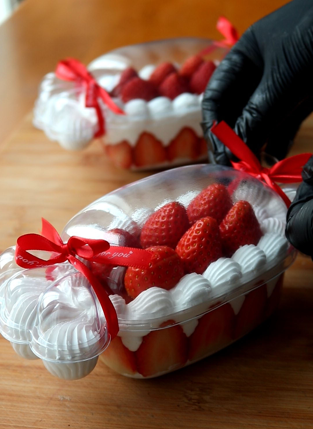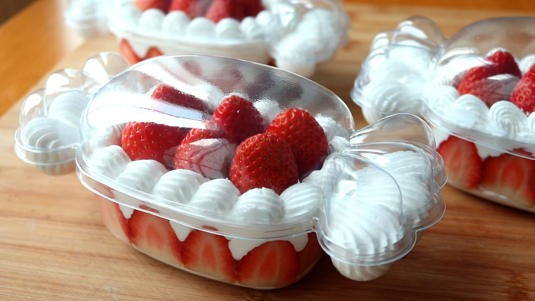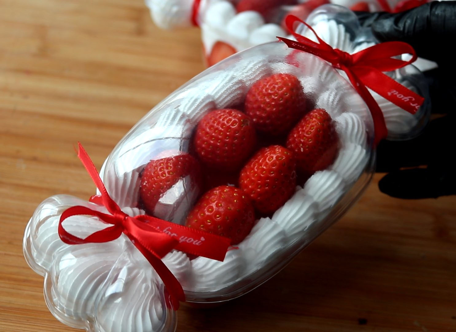 7.บีบวิปครีมลงไปในกล่อง วาดสตรอว์เบอร์รี่ลงไป
