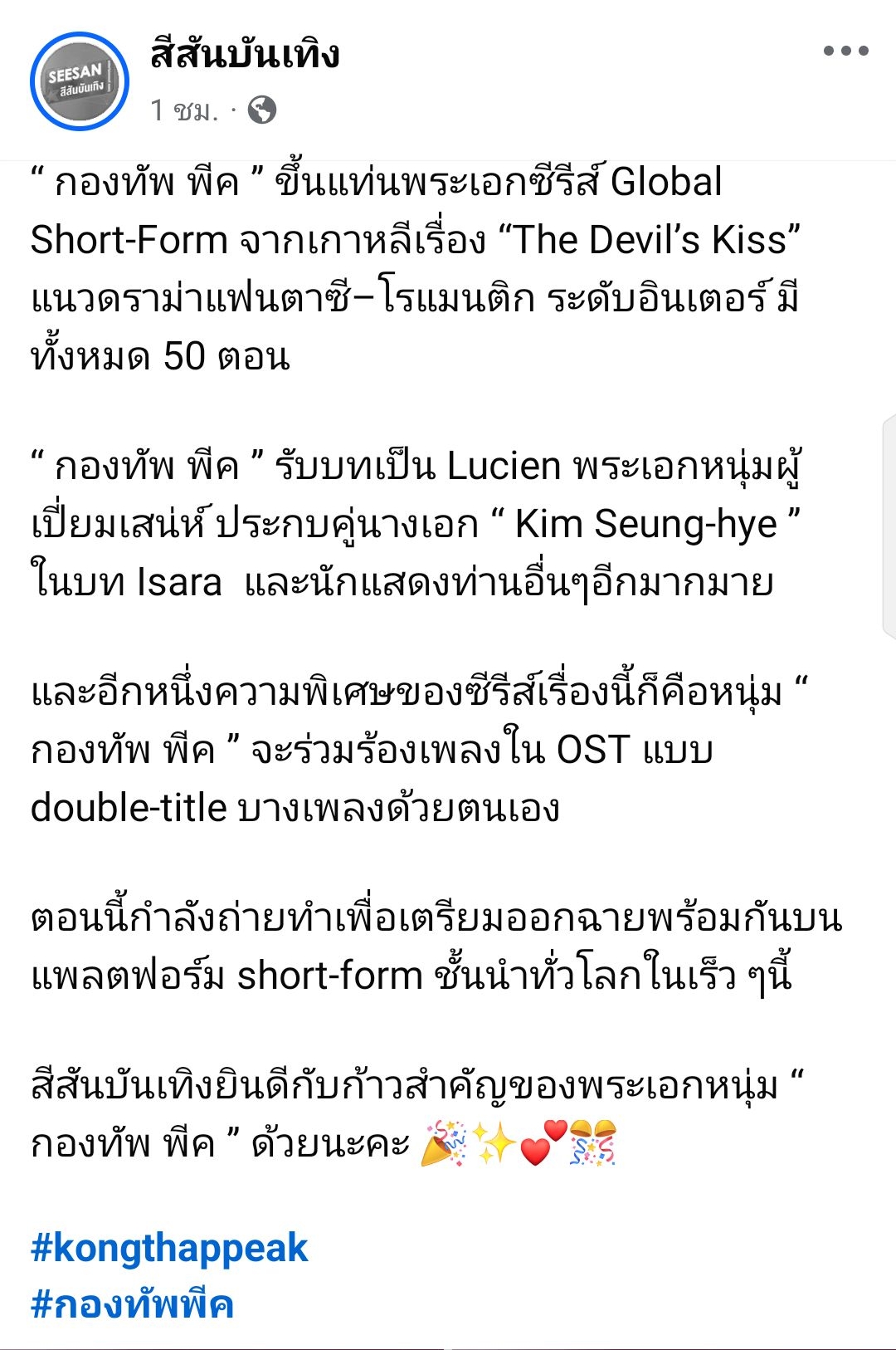 🌟 “กองทัพ พีค” ขึ้นแท่นพระเอกซีรีส์ Global Short-Form เกาหลีเรื่อง “The Devil’s Kiss” แนวดราม่าแฟนตาซี-โรแมนติก