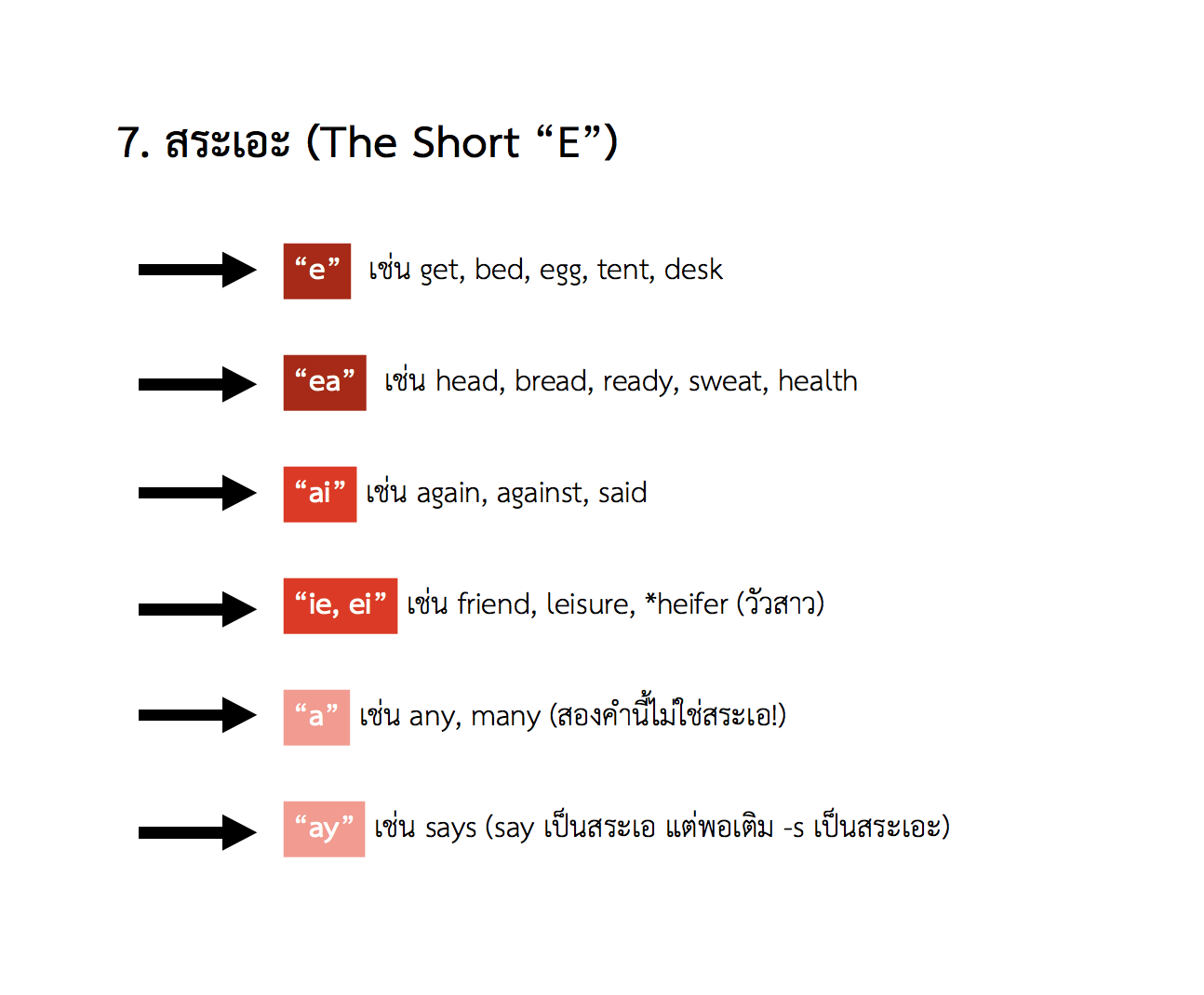 เราจะพบว่าสำเนียงการออกเสียงในคำว่า bed, egg, ready, again, many (และคำอื่น ๆ จากตัวอย่าง) ของเราดีขึ้นทันทีเลย แค่เปลี่ยนจากสระเอเป็นสระเอะเสียงสั้น (เพราะมันคือเสียงสระที่ถูกต้องสำหรับคำเหล่านี้)