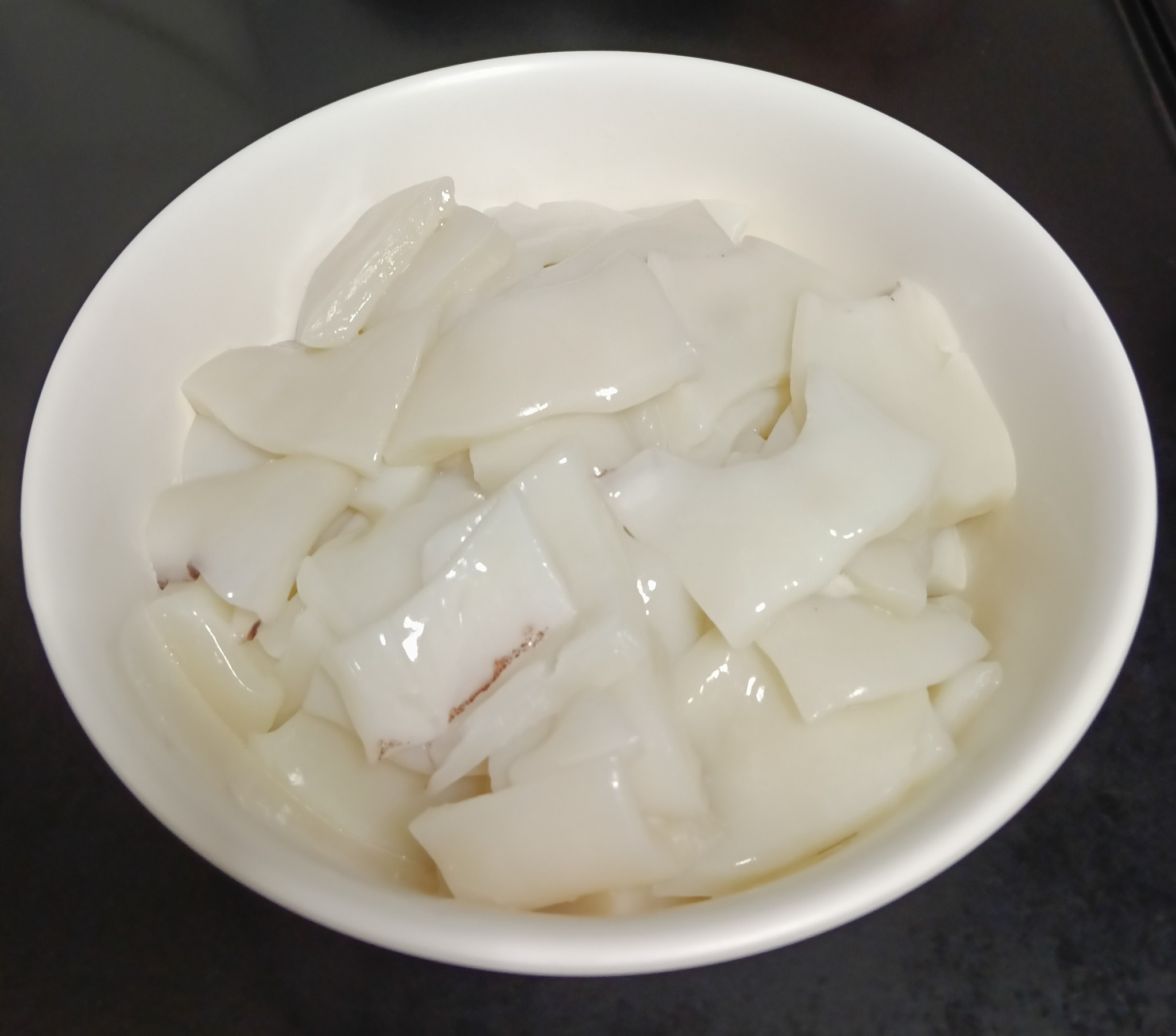 ล้างทำความสะอาดปลาหมึกด้วยน้ำเกลือเพื่อดับกลิ่นคาว แล้วหั่นเป็นชิ้นพอดีคำ