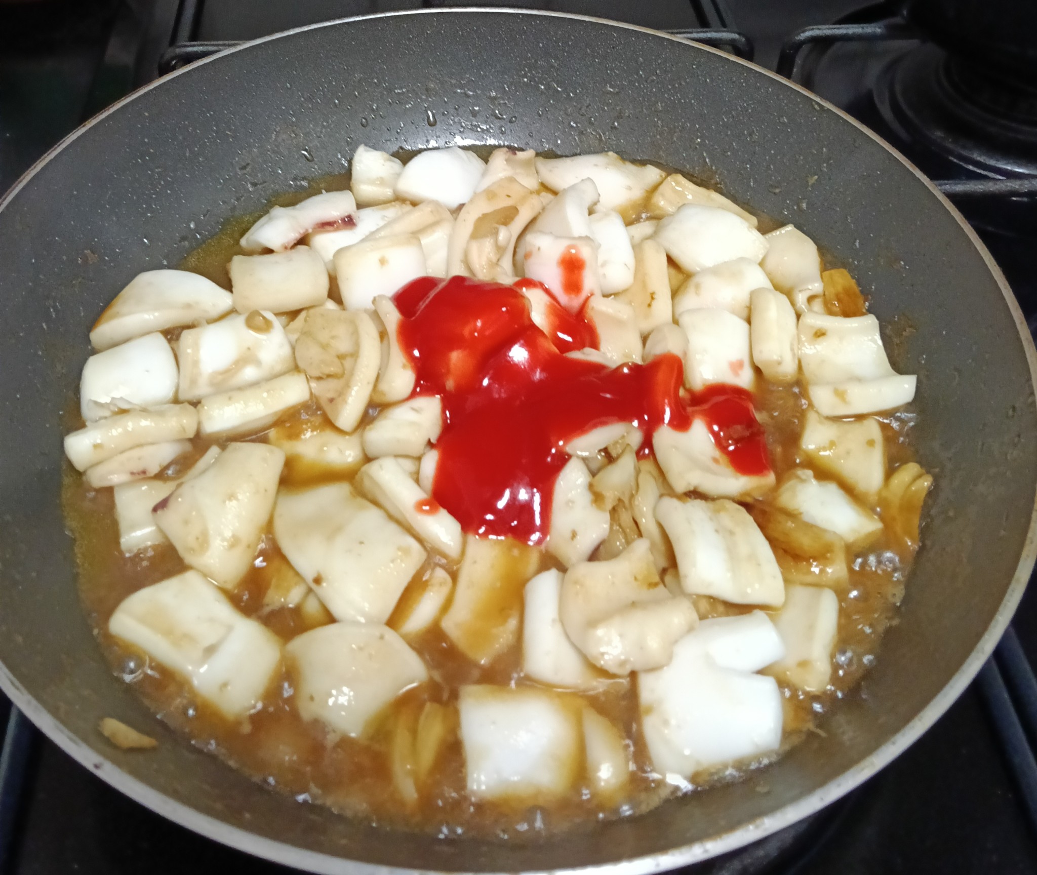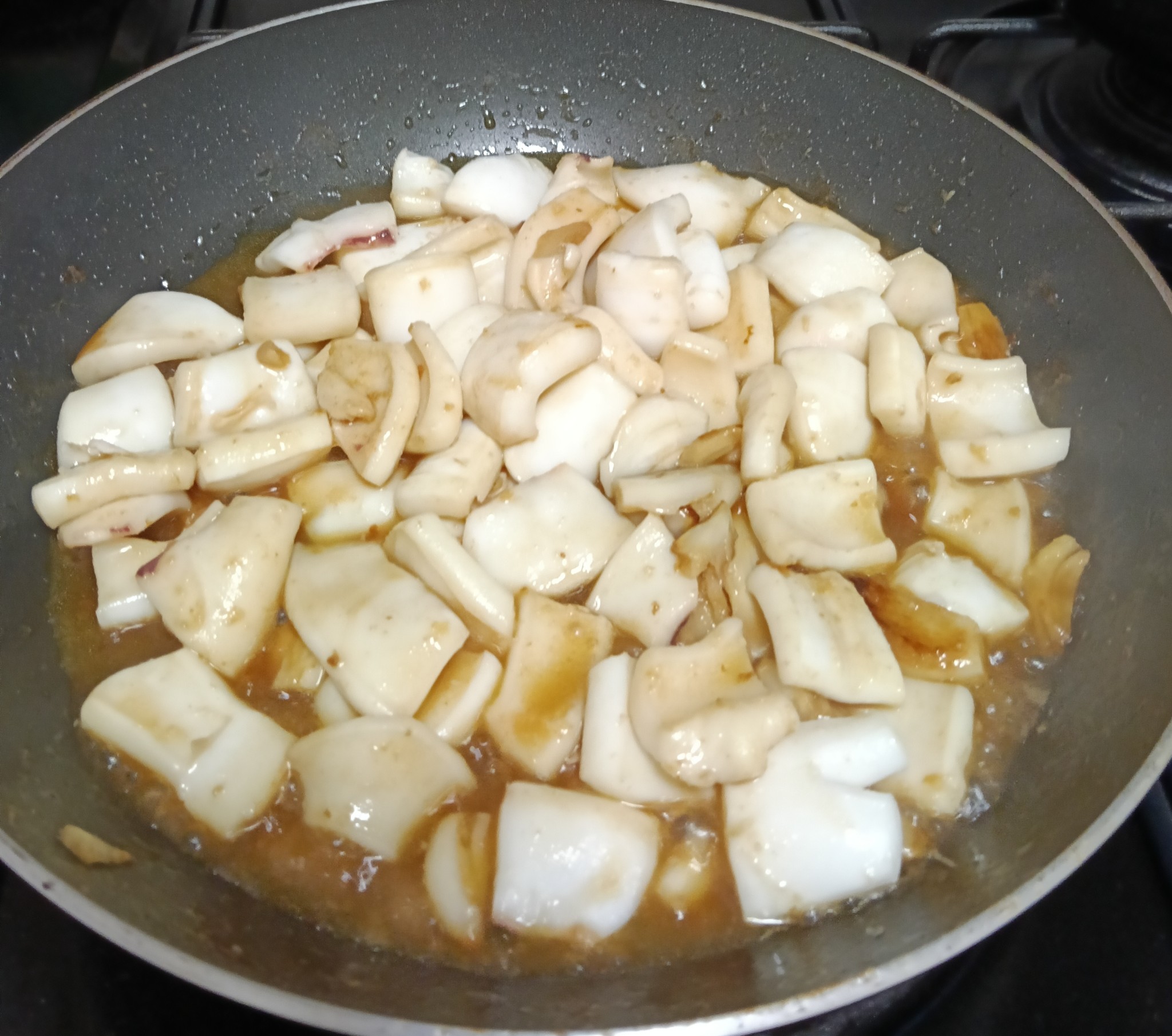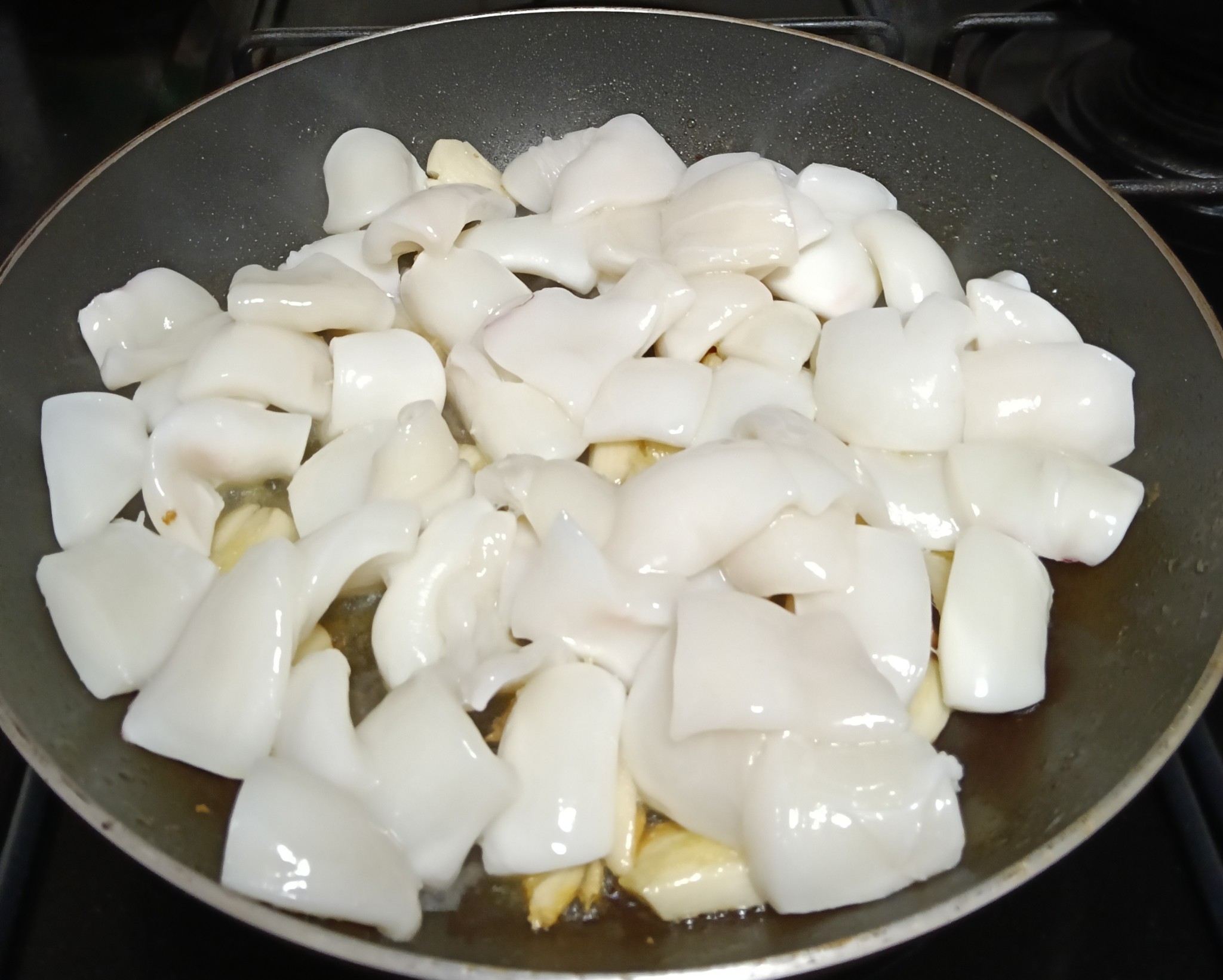 ตามด้วยปลาหมึกที่หั่นไว้ลงไปผัด