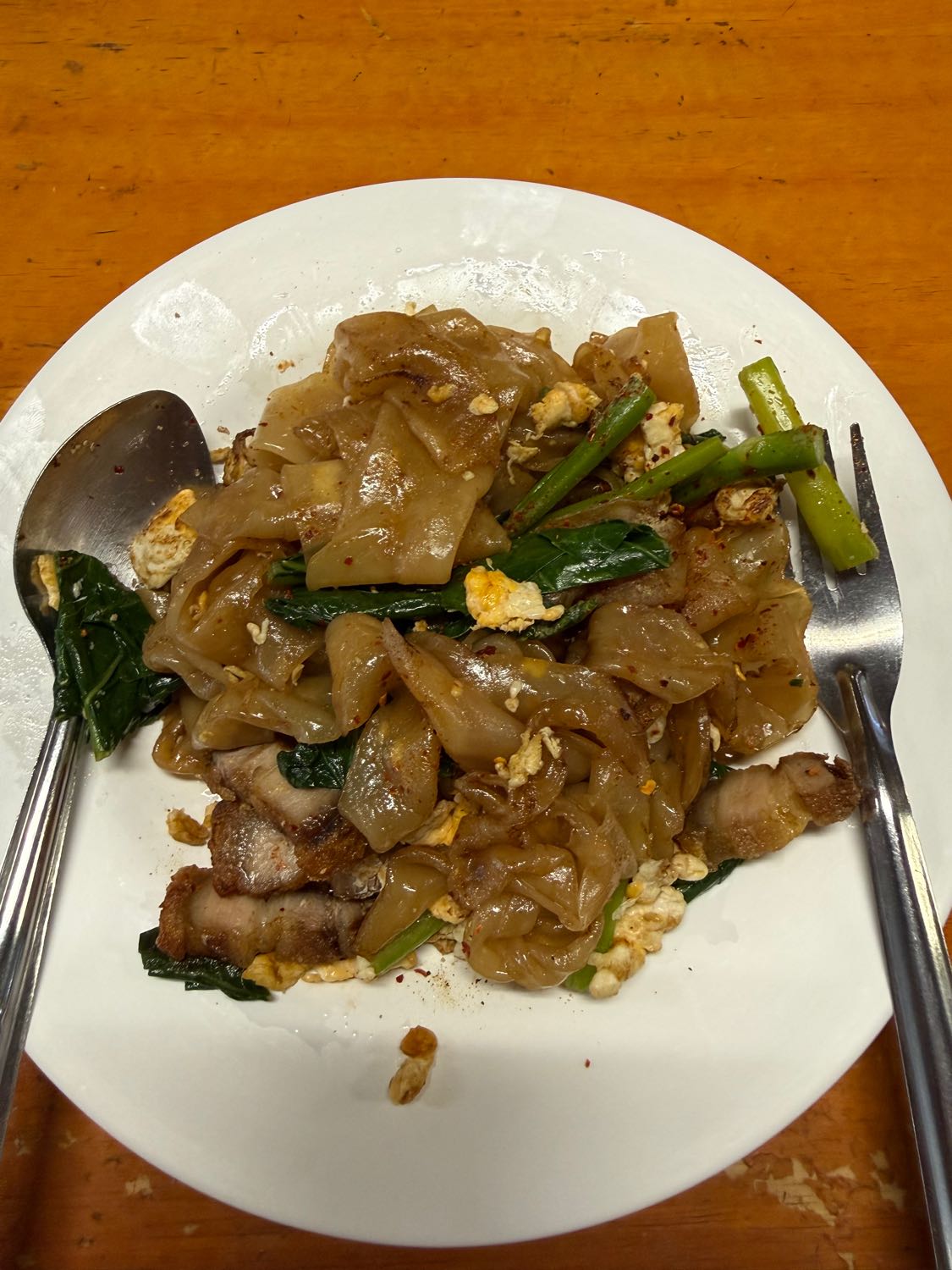 หอมกลิ่นหอมคั่วกระทะ มีความกรอบเกรียมตามวิถีการผัดด้วยไฟแรง ๆ เส้นนุ่มหนึบกำลังดี คะน้าอ่อน ๆ กรอบ ๆ หมูชิ้นโต นุ่มไม่แข็ง ไม่ต้องปรุงเพิ่มก็อร่อยแล้ว จานนี้ 50 บาทค่ะ