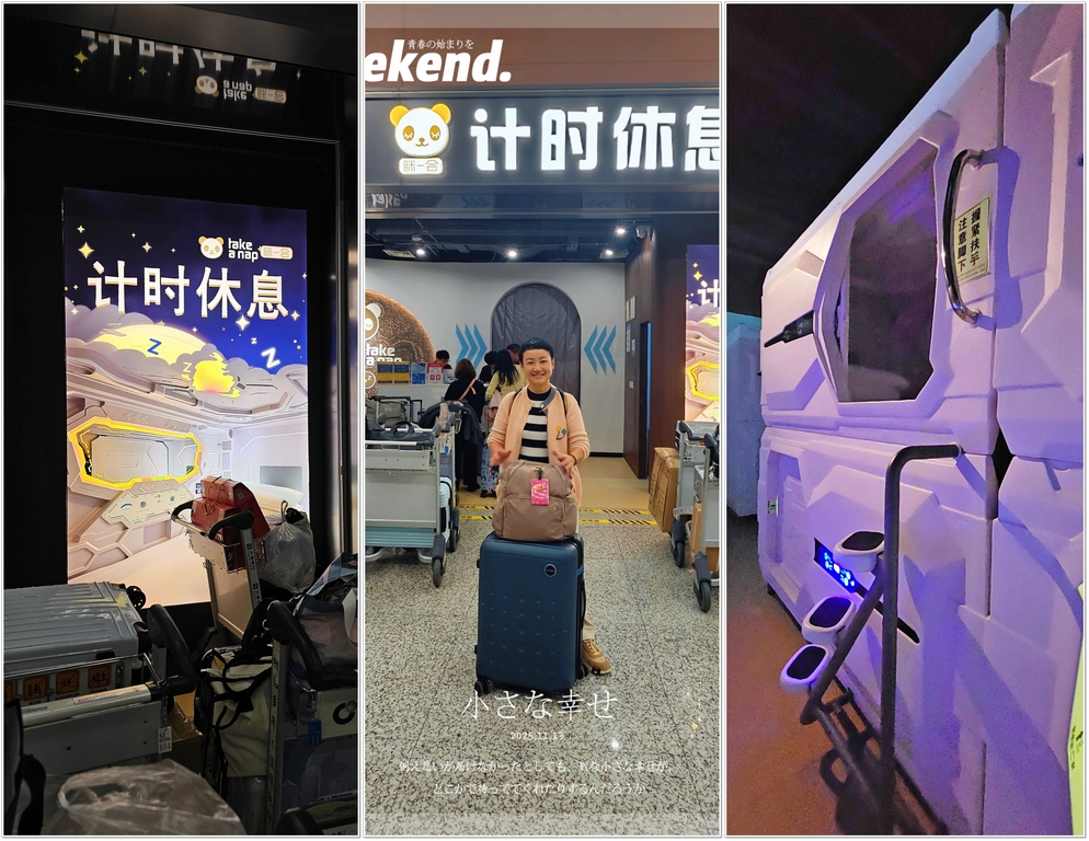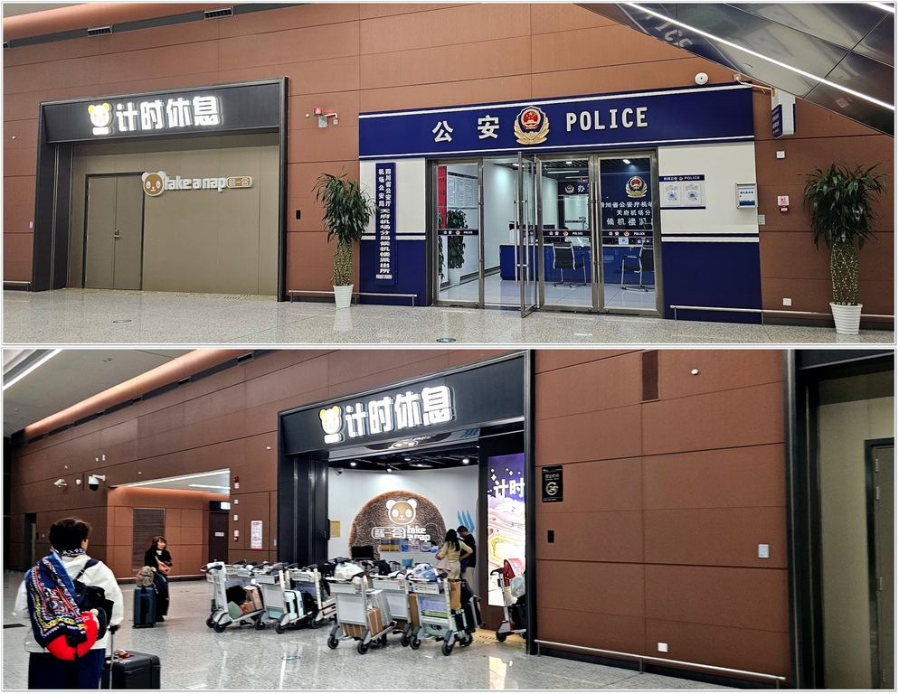 จากจุดจอดเราต้องเดินไกลมากๆกว่าจะมาถึง ตม. ใช้เวลาประมาณเกือบๆ 1ชั่วโมงเราก็ออกมาจาก Terminal 1 และเดินไป Terminal 2 เพื่อจะไปโรงแรม Chendu Tianfu Airport Squint for a while spacecapsule Hotel สนนราคาคนละ 1,091 บาท จากTerminal 1 ไปTerminal 2 ทางเดินยาวไกลและเงียบมาก เก้าอี้ระหว่างทางถูกจับจอง คนนอนเหยียดยาวทุกตัว มีแต่เรา 3คนที่เดินมาTerminal 2 เพราะคนอื่นๆคงออกไปขึ้นรถเข้าเมืองกันหมดแล้ว