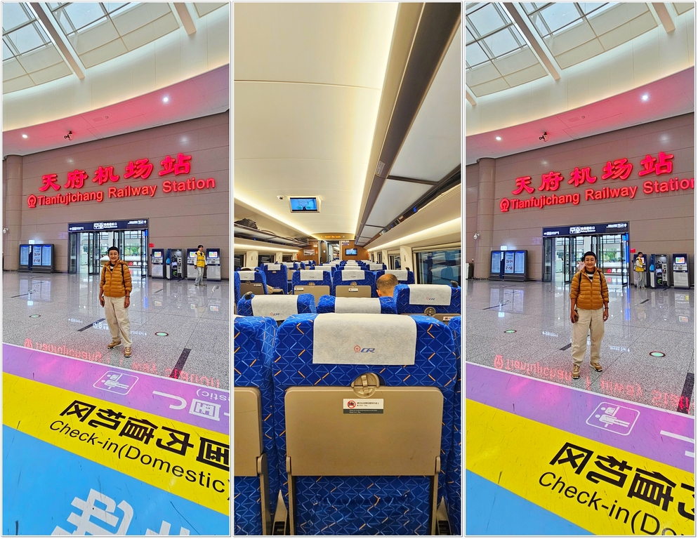 เดินลงไปชั้นใต้ดินไปที่สถานีรถไฟความเร็วสูง Tianfujichang Railway Station การโดยสารรถไฟความเร็วสูงของเฉิงตูเมื่อซื้อตั๋วแล้ว ก่อนเข้าสถานีต้องมีการสแกนสัมภาระทุกครั้ง รวมทั้งรถไฟใต้ดินด้วย โดยเฉพาะขวดน้ำจะสแกนเป็นพิเศษ จากนั้นก็ต้องดูรถขบวนที่เราจะไปจากจอใหญ่ แล้วก็ไปเข้าคิวที่ Gate นั้นๆ