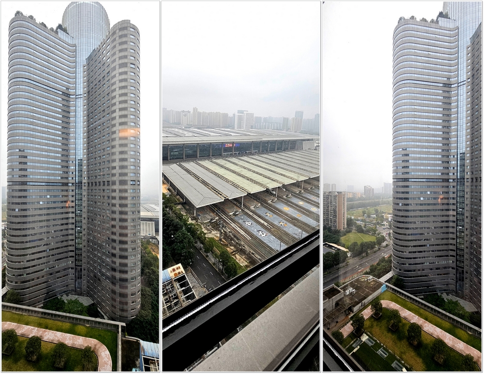 ไม่ใช่ที่นี่ต้องเดินออกไปข้างนอกเลี้ยวซ้ายไปก็เดินออกไป ยังหาไม่เจอเดินวนมาถามใหม่เลยถึงบางอ้อ ว่าชื่อโรงแรมเหมือนกันแต่ต่อท้ายไม่เหมือนกัน เพราะเป็น Hotel กับ Hotel Apartment กว่าจะเจอก็ทำเอางง พอเข้าไปเช็คอินแล้วถามว่าตอนนี้มีห้องที่เราสามารถเช็คอินได้ตอนนี้เลยไหม ปรากฏว่ามีห้องสามารถเช็คอินได้เลยจ้า เราจองไว้ 2 คืน ห้องนอนได้ 3 คนสนนราคา 2728 บาท หาร 3 ตกคนละ 909 บาท ถูกมากๆ ห้องพักอยู่บนชั้น 21 เห็นวิวสถานีรถไฟความเร็วสูงเฉิงตูตะวันออก